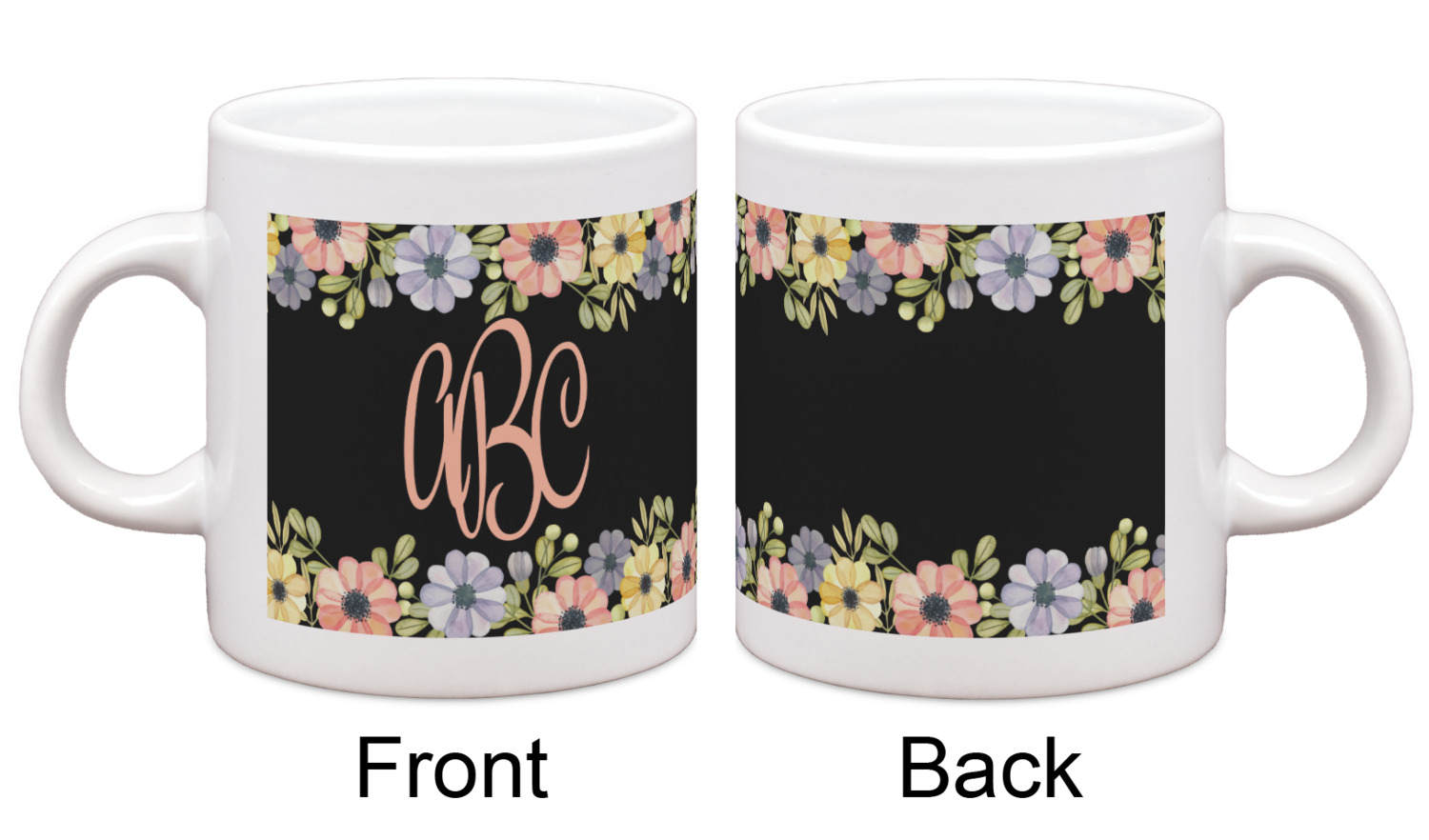 Each of our espresso mugs is a ceramic material sure to keep your drink warm. Personalize one cup for yourself, or order a set of 4! Its the perfect little gift for any coffee lover! We carry two sizes for you to personalize - 3 oz. (approx. 3.25" x 2.325" x 2.625") or 6 oz. (approx. 4" x 2.9" x 2.9"). Our 3 oz. mug is perfect for that single shot espresso while our 6 oz. mug can be your next favorite cappuccino cup holding two shots of espresso!