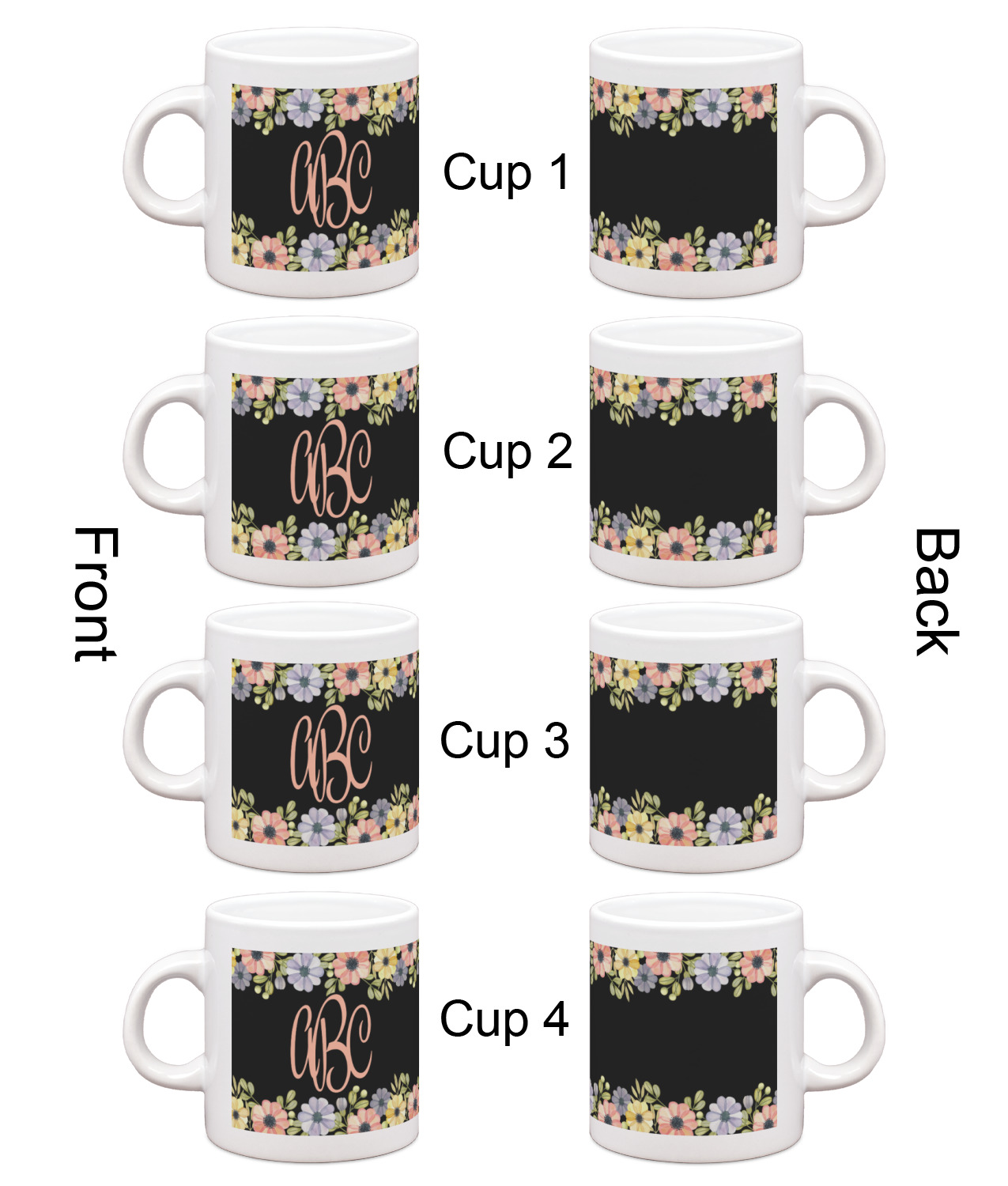 Each of our espresso mugs is a ceramic material sure to keep your drink warm. Personalize one cup for yourself, or order a set of 4! Its the perfect little gift for any coffee lover! We carry two sizes for you to personalize - 3 oz. (approx. 3.25" x 2.325" x 2.625") or 6 oz. (approx. 4" x 2.9" x 2.9"). Our 3 oz. mug is perfect for that single shot espresso while our 6 oz. mug can be your next favorite cappuccino cup holding two shots of espresso!