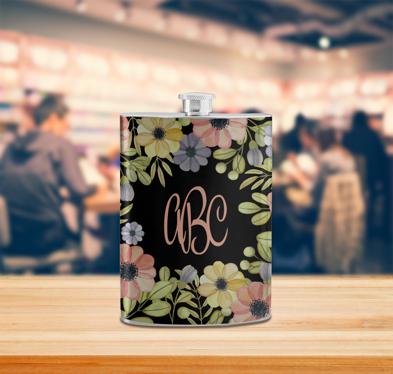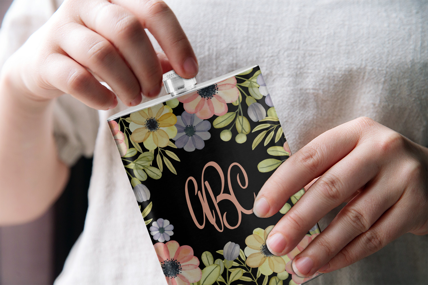 This design features a gorgeous black background with a frame of colorful wild flowers and greenery. You will find pinks, purples, and greens. But, if you were looking for other colors or types of flowers, be sure to take a peek in our design center at the other fun floral frame backgrounds we have. In the middle of this floral design you will find a three letter monogram to give an opportunity for our favorite thing: personalizing!
