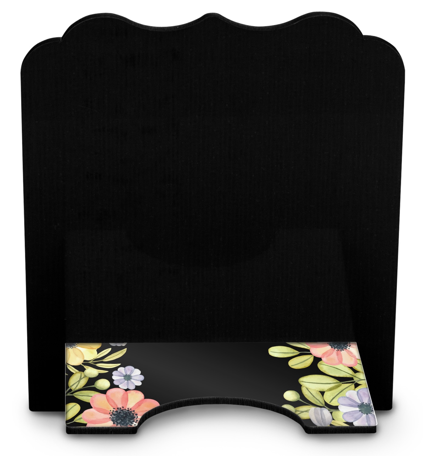 The stand is comprised of two hardboard pieces that fit snugly together and stabilize one another. The bottom part of the iPad stand supports your tablet, and has space for your tablets charger while in use. At 9.25" x 11.5", this tablet mount can support a device between the sizes of the iPad Pro and the iPad Mini 2. The uppermost part of the stand features a decorative, curved edge for a classy, suave appearance. We print your customization atop the face of the stand, in vibrant color. The remaining sides are colored a sleek black.