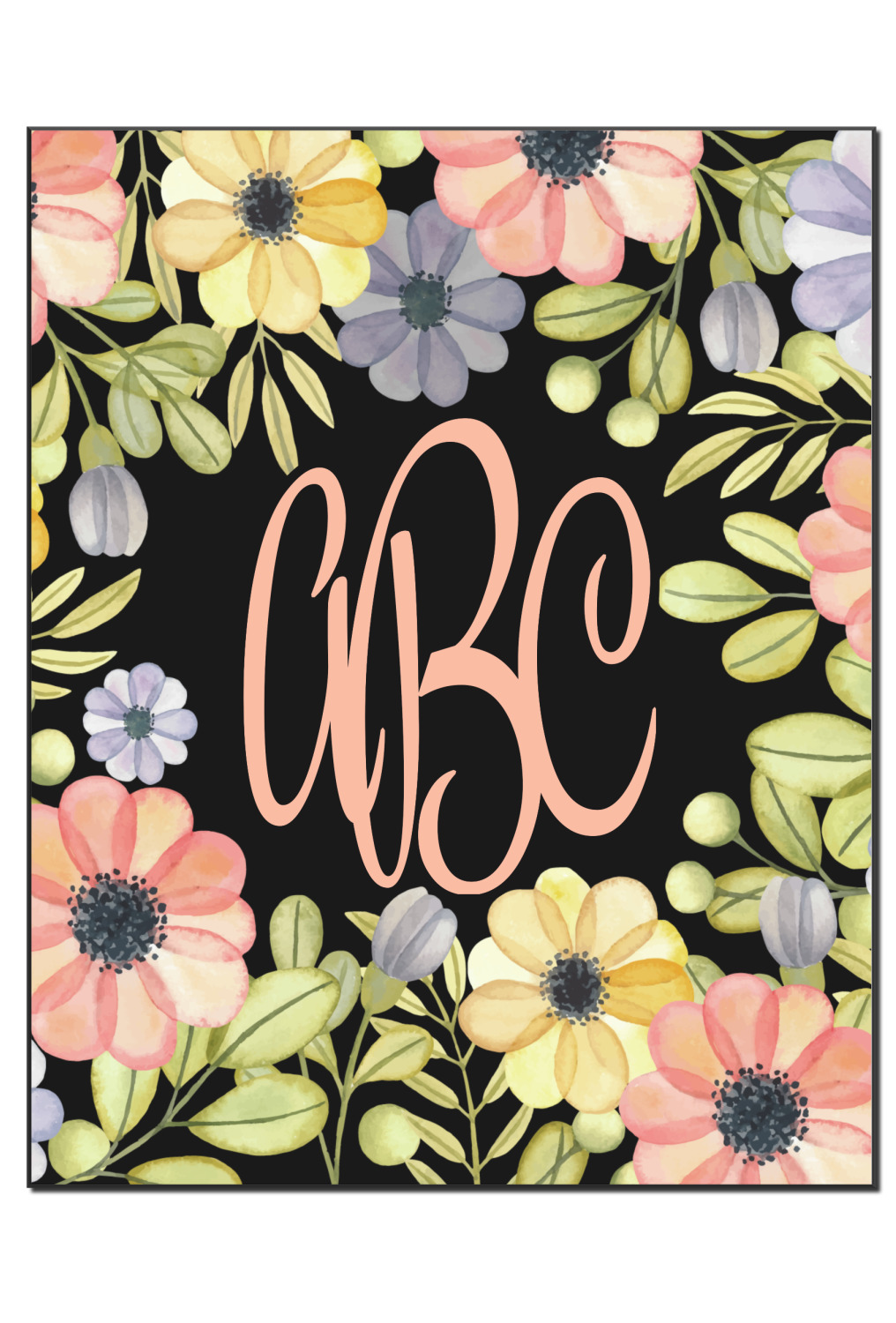 This design features a gorgeous black background with a frame of colorful wild flowers and greenery. You will find pinks, purples, and greens. But, if you were looking for other colors or types of flowers, be sure to take a peek in our design center at the other fun floral frame backgrounds we have. In the middle of this floral design you will find a three letter monogram to give an opportunity for our favorite thing: personalizing!