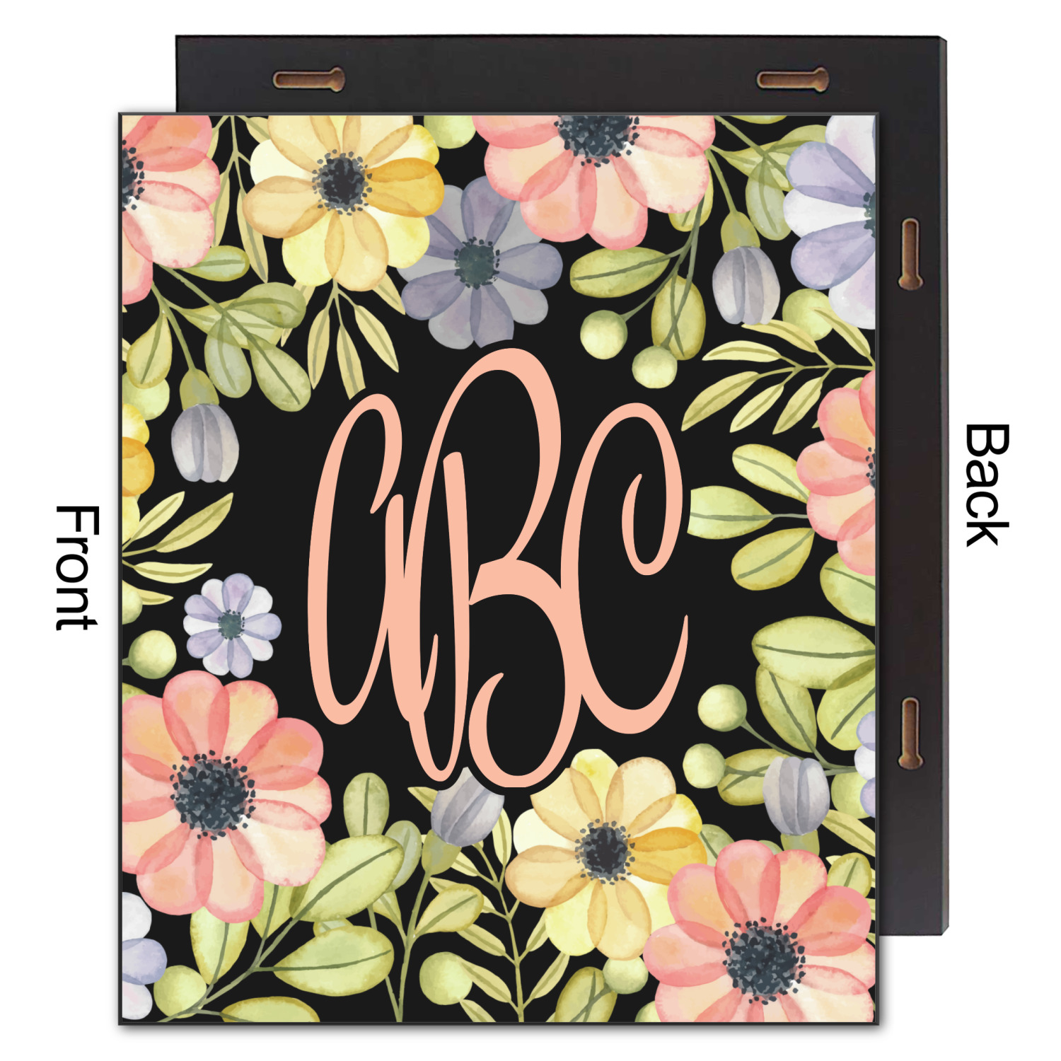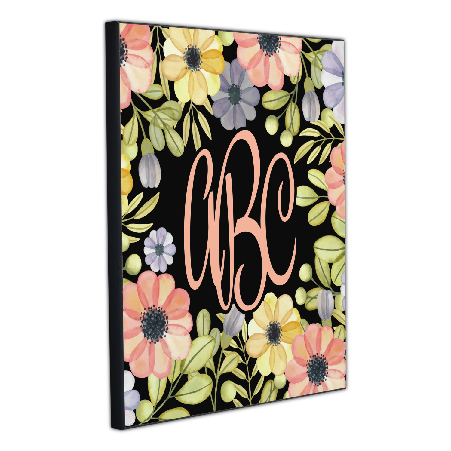 This design features a gorgeous black background with a frame of colorful wild flowers and greenery. You will find pinks, purples, and greens. But, if you were looking for other colors or types of flowers, be sure to take a peek in our design center at the other fun floral frame backgrounds we have. In the middle of this floral design you will find a three letter monogram to give an opportunity for our favorite thing: personalizing!