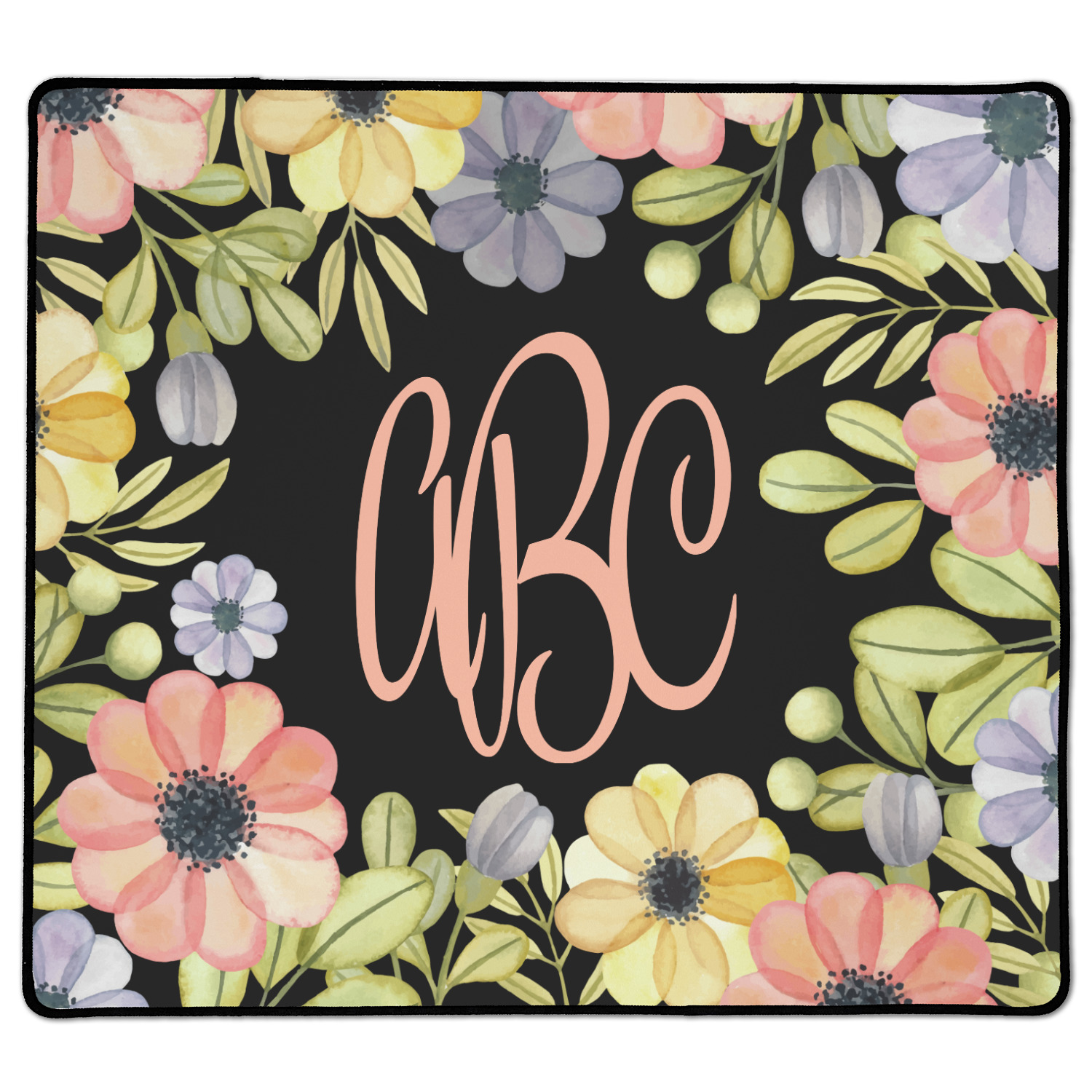 This design features a gorgeous black background with a frame of colorful wild flowers and greenery. You will find pinks, purples, and greens. But, if you were looking for other colors or types of flowers, be sure to take a peek in our design center at the other fun floral frame backgrounds we have. In the middle of this floral design you will find a three letter monogram to give an opportunity for our favorite thing: personalizing!