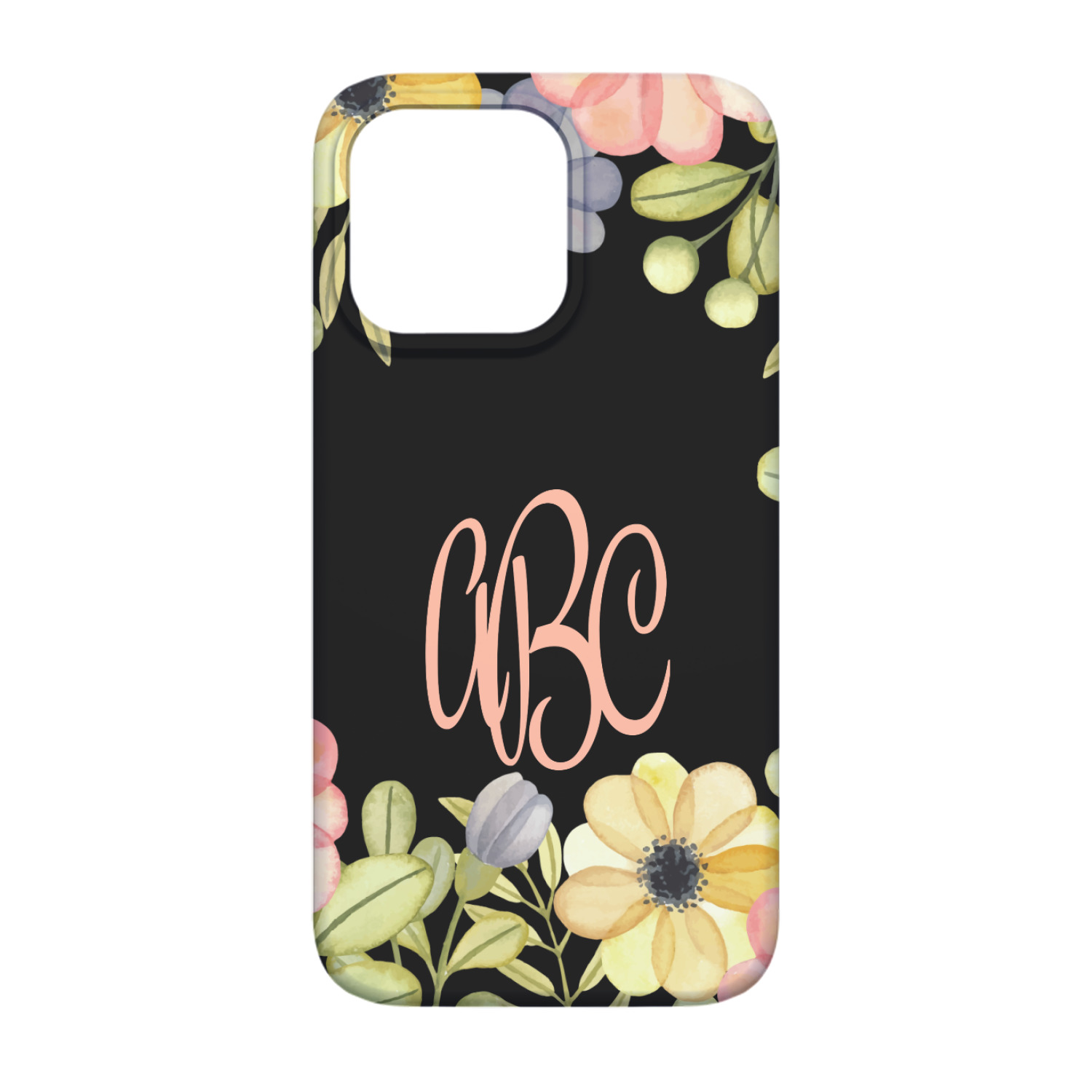 This design features a gorgeous black background with a frame of colorful wild flowers and greenery. You will find pinks, purples, and greens. But, if you were looking for other colors or types of flowers, be sure to take a peek in our design center at the other fun floral frame backgrounds we have. In the middle of this floral design you will find a three letter monogram to give an opportunity for our favorite thing: personalizing!