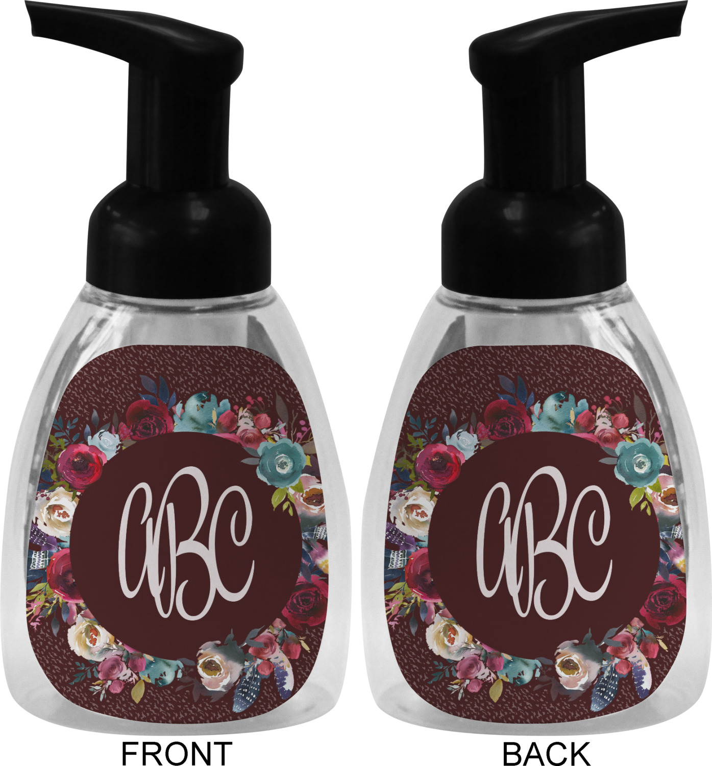 This soap dispenser is made of a robust plastic and has a clear base. The included soap pump is available in black or white color. This dispenser is 6.5 inches tall, 3 inches wide, and 2 inches deep. We display your customized designs on the front and back sides of these foaming hand soap dispensers.