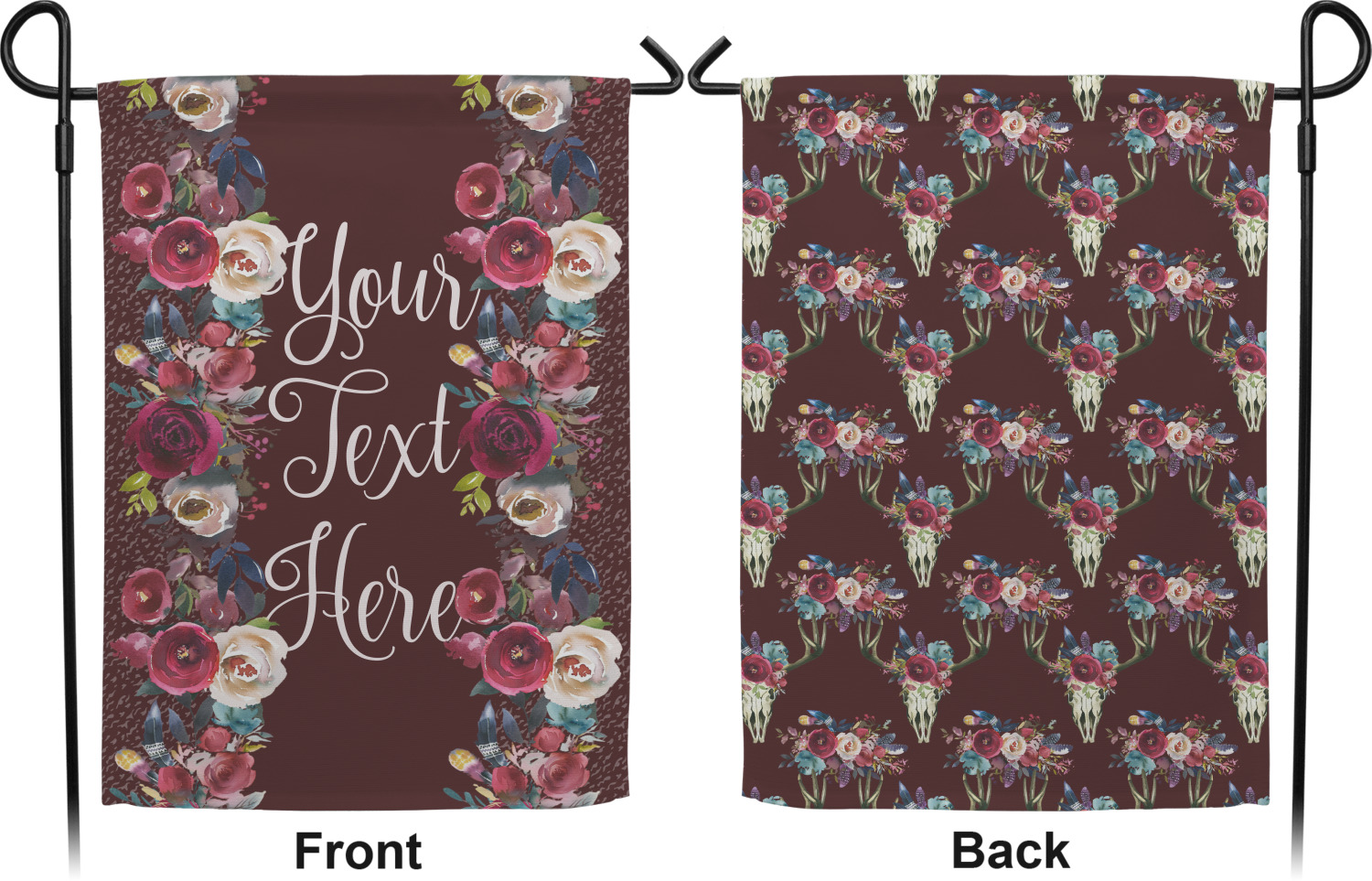 These custom garden flags are made of a durable, double-ply, polyester weave, allowing them to withstand the elements year round. The small flags measure at approximately 12 by 18 inches. The large flags measure out to 28 by 37 inches. You can order these decorative flags with your customization printed on the front only, or the front and back.