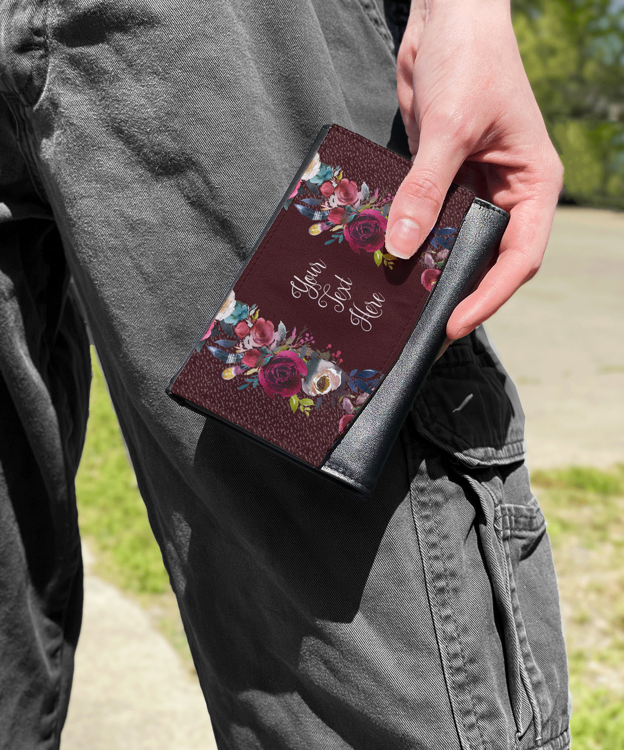 The compact size of this wallet - 5.5in wide, 3.5in tall and 0.75in thick when folded - makes it perfect to hold in hand and small enough to fit in a clutch or a normal size purse. The outside flap is customized with your choice of artwork and closes with a snap closure - with two different snaps to allow it to be adjusted when storing more items - to securely fasten the flap.
