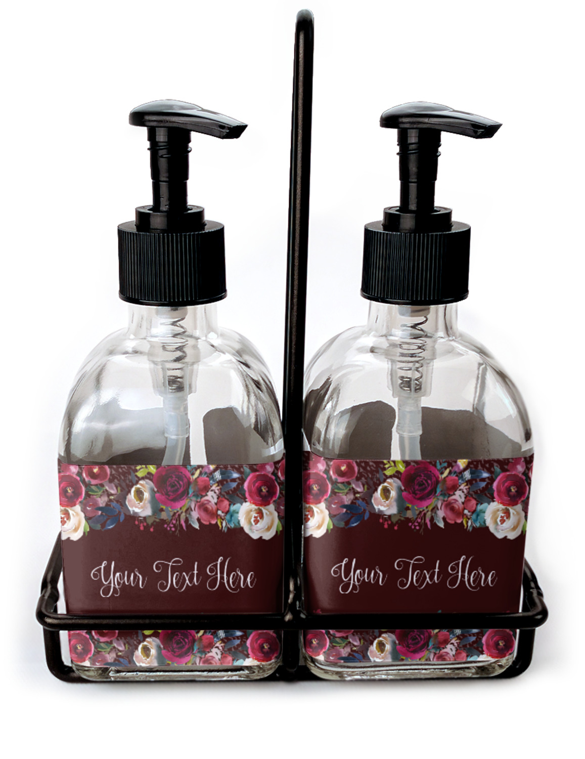 You can purchase these personalized soap dispensers as singulars, or as a set with two bottles. With your purchase of the set, we include a black frame that complements the black color of the pumps and adds to the overall classy look of the piece.