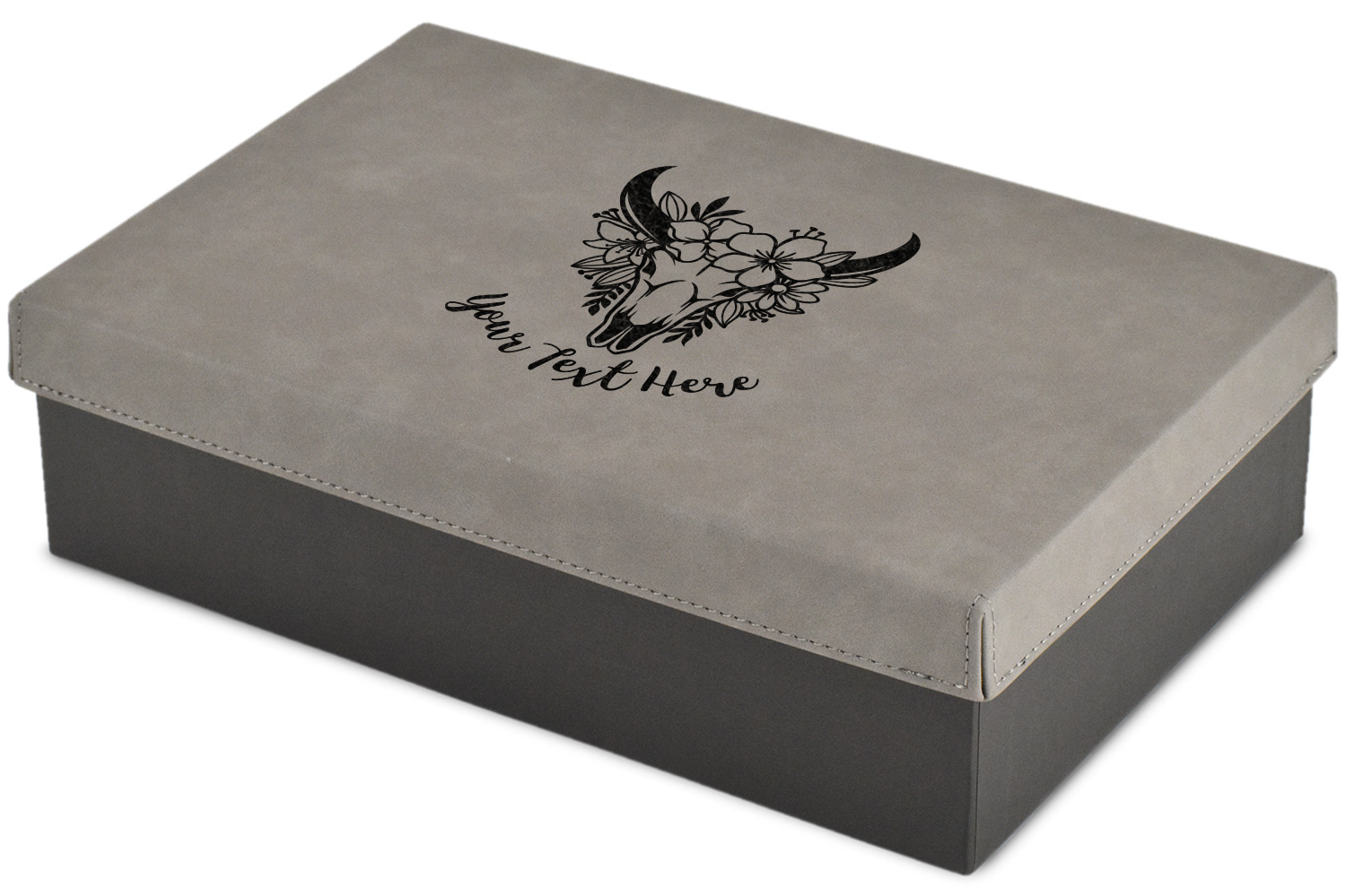 These gift boxes are available in 3 different sizes to accommodate various sized gifts. Available in gray as a neutral color for any occasion as well as to showcase your design boldly. Engraved with a laser this high quality paper board and faux leather gift box is unique and makes any gift stand out.