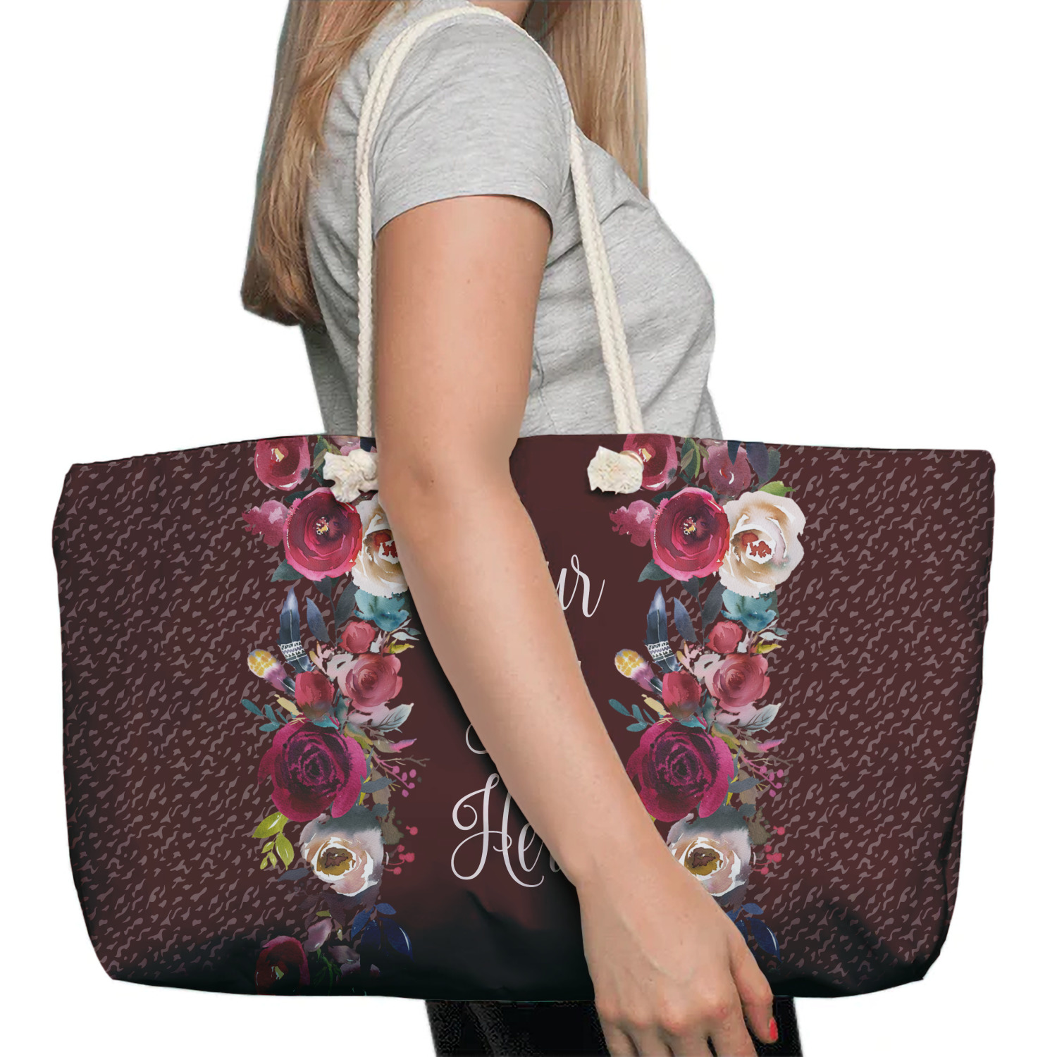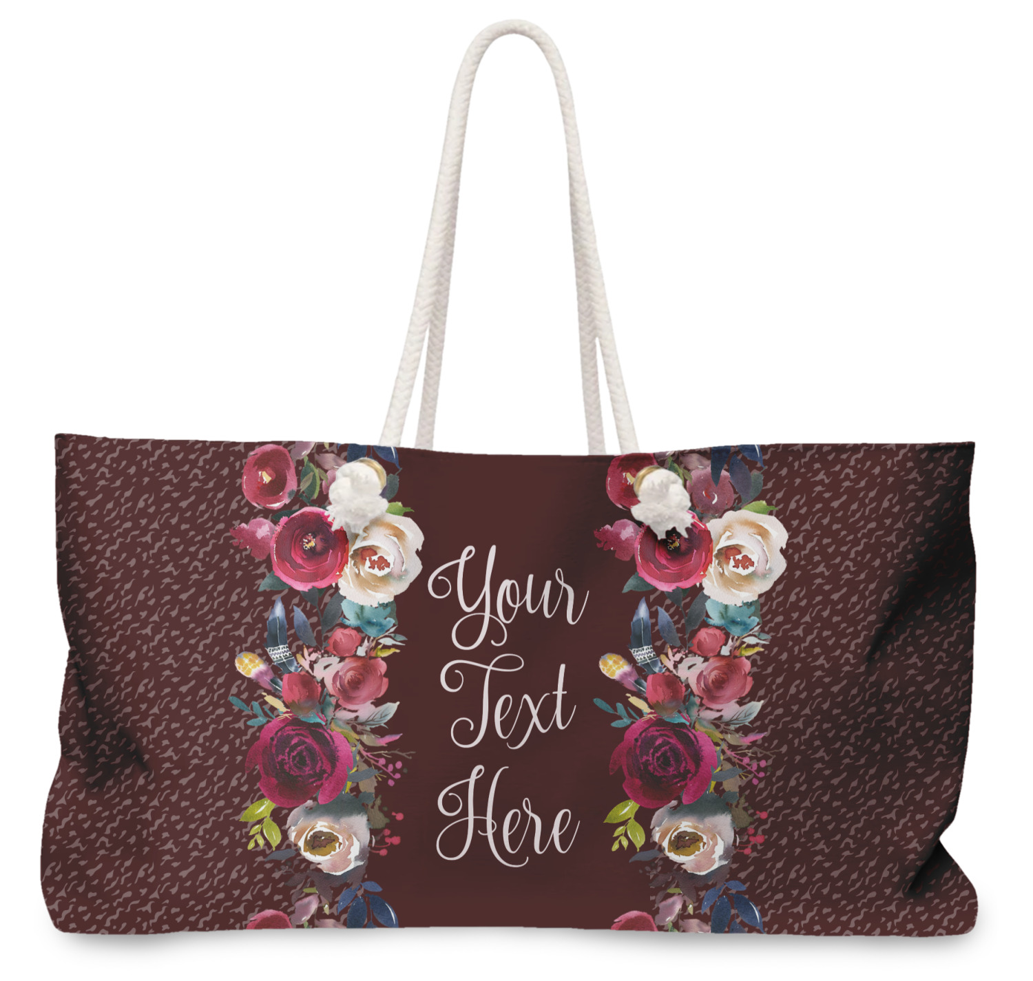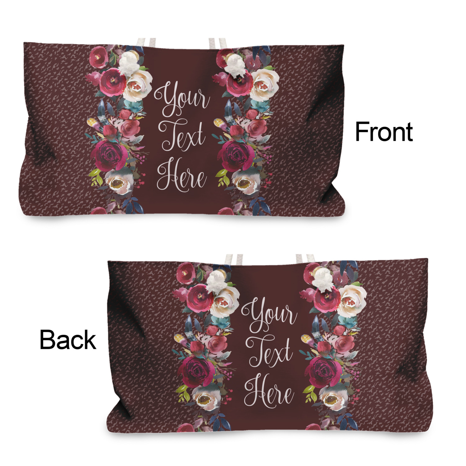 These weekender totes can be customized front and back. The totes are full all over print - so the choice of how background are endless - from beautiful floral or leaf patterns to geometrics or some classic Van Gogh artwork - the possibilities are endless. The totes can also be decorated with photos and logos.