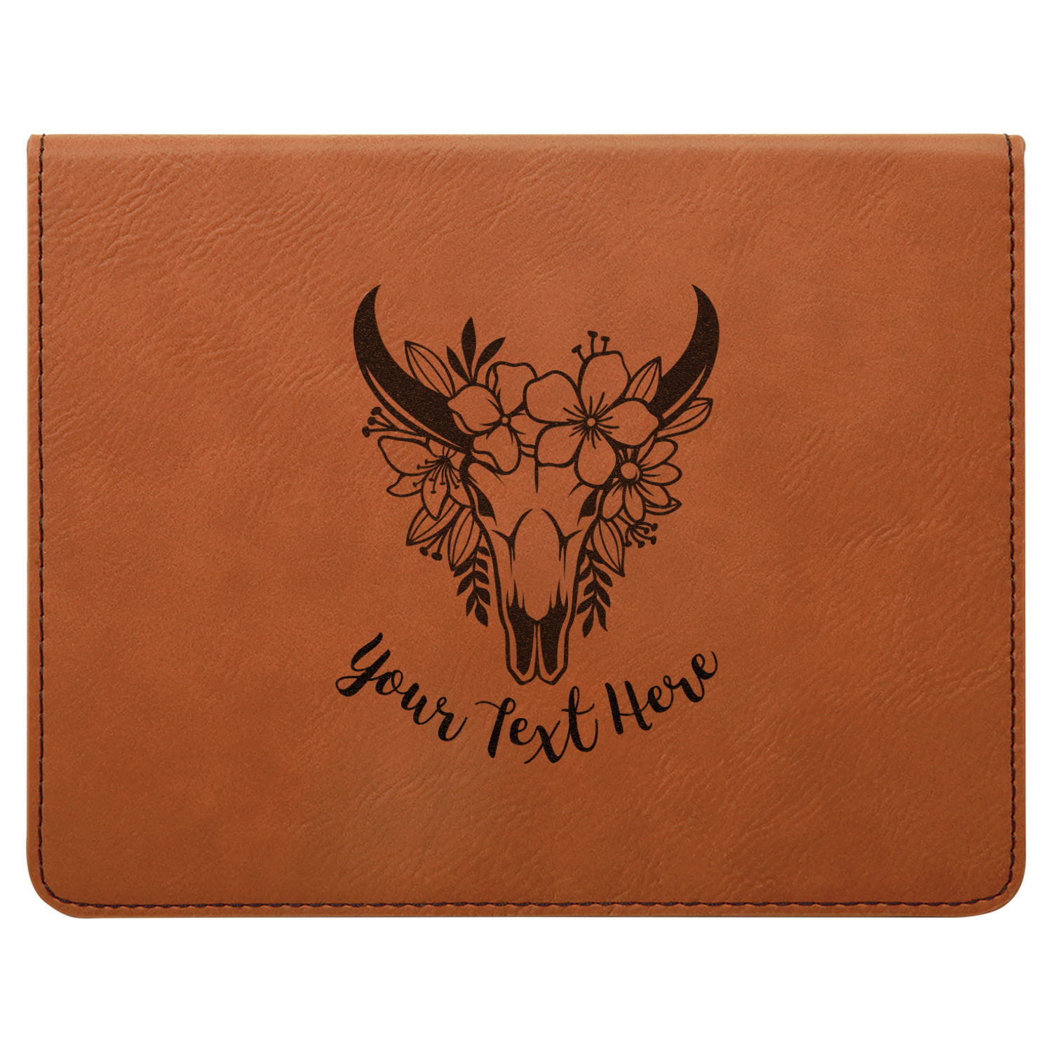 This set includes a wine stopper, pourer, drip ring, and a corkscrew! The exterior of the box is a gorgeous, cognac-brown leatherette, while the interior is covered in a black, velvety material. Four foam indentations, unique to the shape of the wine tool, are found at the bottom half of the box's interior. The tools fit snugly into each of their designated spots, and the foam material helps to protect the integrity of your tools. Each of the wine gadgets features a bamboo accent, with the location and style depending on the tool itself. We laser engrave your personalized design onto the lid of the box, which easily flips open and is secured closed by a small magnet. The wine accessories box measures at 7 by 5.5 inches in total.