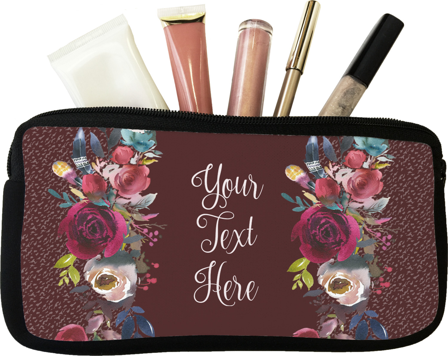 Our personalized makeup bags are available in many different designs, patterns and colors - so you are sure to find one that will love. They are made of neoprene (same material as wet-suits) and thus are water resistant, so spillages in your makeup bag will not end up all over you purse. They are customized on one side and are black on the other side and the zipper is black as well.