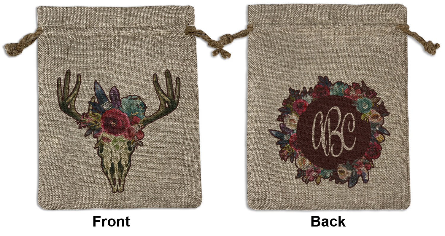 We sell our Burlap Gift Bags in 3 variant sized bags. Made with burlap polyester, each personalized bag can be secured with a twine drawstring pull. Your custom design is available to print on one side or both sides - completely up to you! The sizes of the bags measure approximately 4.5" x 6.5" for the smallest size, 6.5" x 8.0" for the medium size, and 6.5" x 13.5" for the large-sized bag.