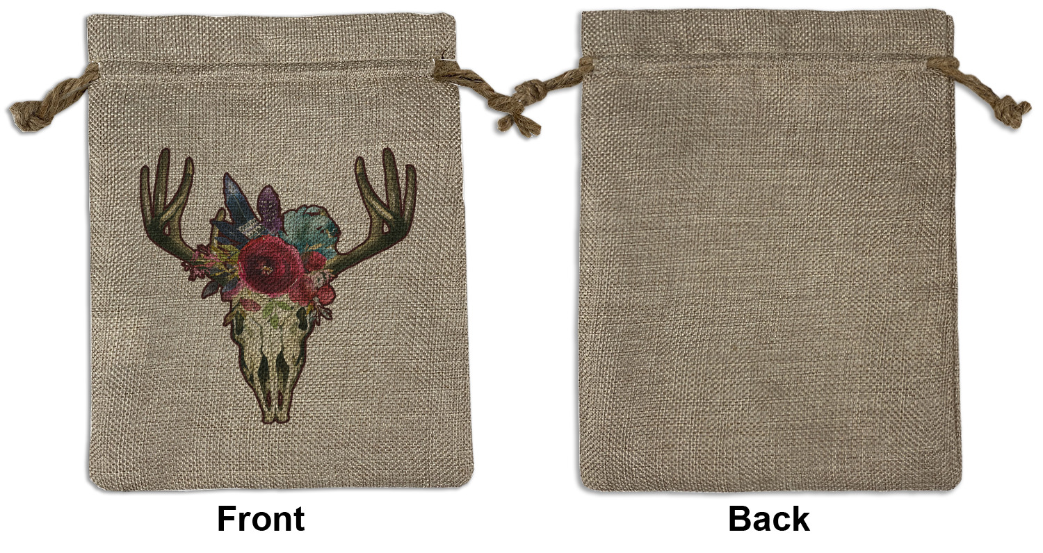 We sell our Burlap Gift Bags in 3 variant sized bags. Made with burlap polyester, each personalized bag can be secured with a twine drawstring pull. Your custom design is available to print on one side or both sides - completely up to you! The sizes of the bags measure approximately 4.5" x 6.5" for the smallest size, 6.5" x 8.0" for the medium size, and 6.5" x 13.5" for the large-sized bag.