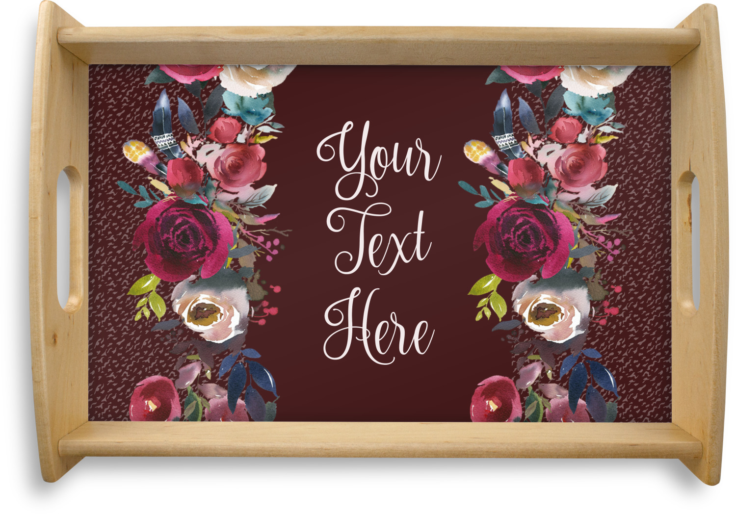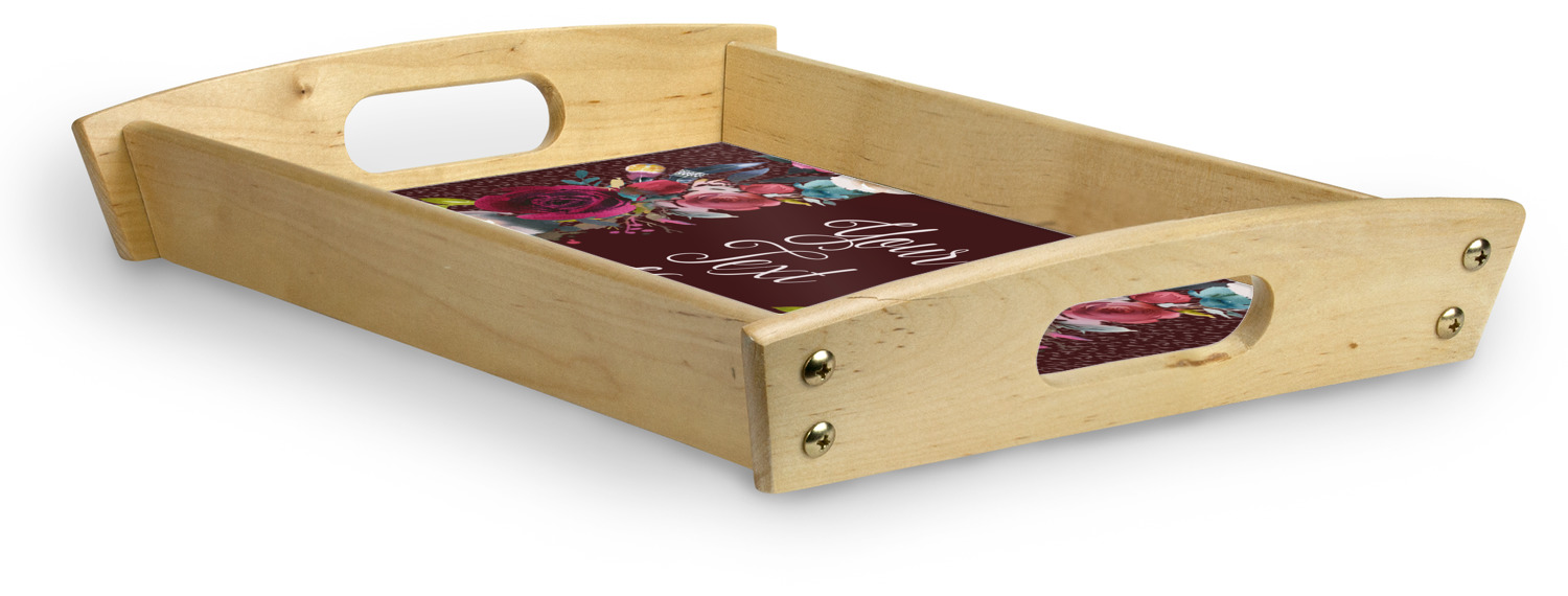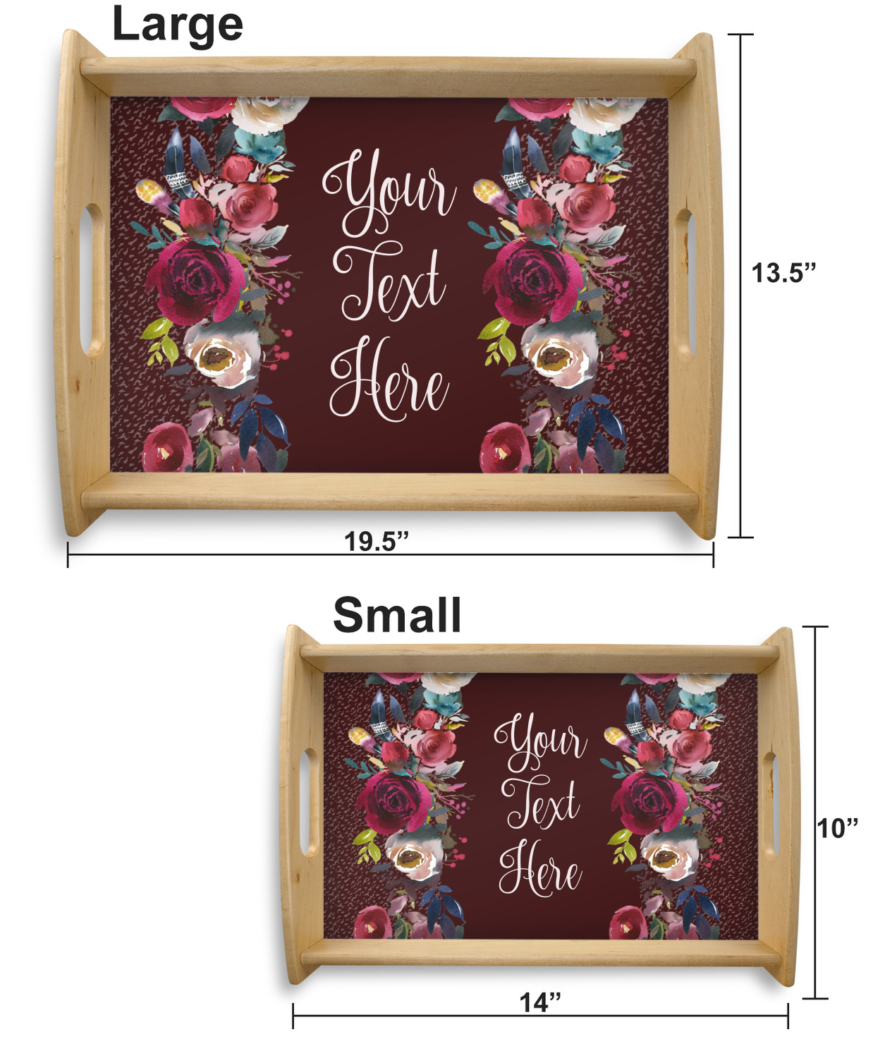 This serving tray with handles features square edges and two rounded sides, creating a very modern look. Each side is fabricated from a beautifully cut, natural wood. The bottom of the interior of the tray displays your customized design in bright, vibrant color. The tray is sold in both a black color and a natural wood look. Each variation of the wood serving tray has two sizes: Small, which is 14" x 10" x 2.25", and Large, which is 19.5" x 13.5" x 2.75".