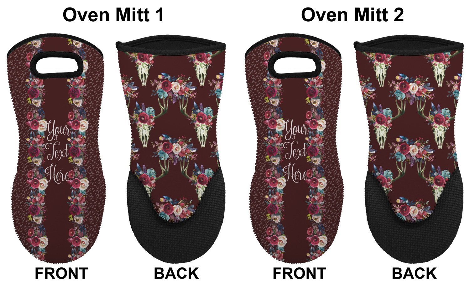 These heat resistant gloves are made entirely of a durable neoprene; the front features a softer texture, while the palm's side has a textured surface, meant to handle heat up to 500 degrees Fahrenheit. Thick, heavy duty stitching connects the two sides. A small, oval cutout appears on the front, and can be used to hang and store the mitt. Your personalization appears on the front, and the upper part of the back of the mitt. The style of these oven mitts are suitable for both the right and left hand, depending on your needs. If you need one for each hand, be sure to order two!