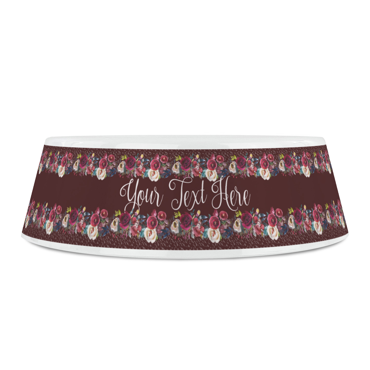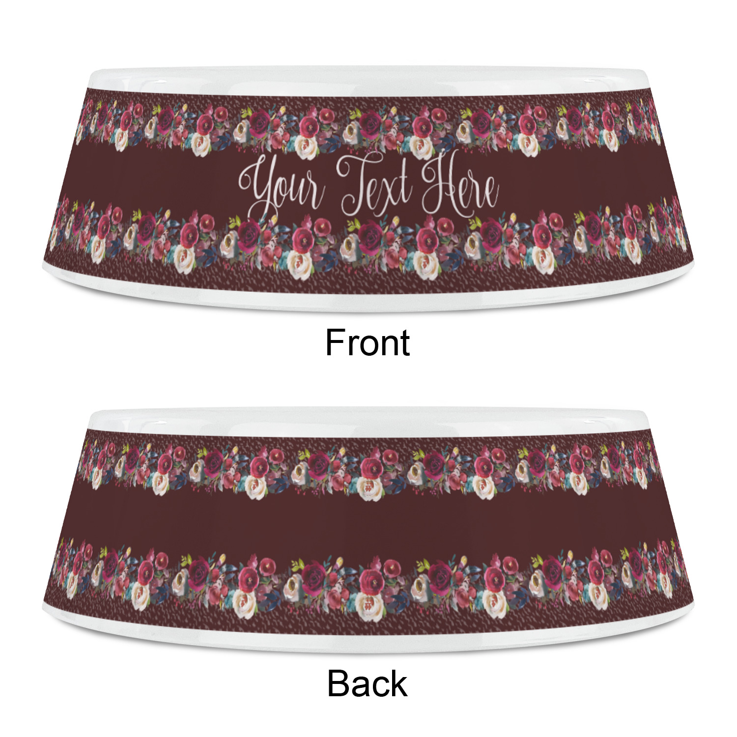 Made from a nearly indestructible composite polymer plastic these bowls come in 3 different sizes to suit any breed of dog. The small bowl measures approximately 5 in diameter and 1.75 tall and holds approximately 1.5 cups of food or water. The medium bowl measures approximately 6 in diameter and 2.25 tall and holds approximately 3 cups of food or water. The large bowl measures approximately 7.2 in diameter and 2.25 tall and holds approximately 4.5 cups of food or water. These bowls are microwave and dishwasher safe so no matter what type of food your dog eats it can be easily cleaned up for the next use. Design your own or use one of our 500 plus designs to make these pet bowls uniquely yours.