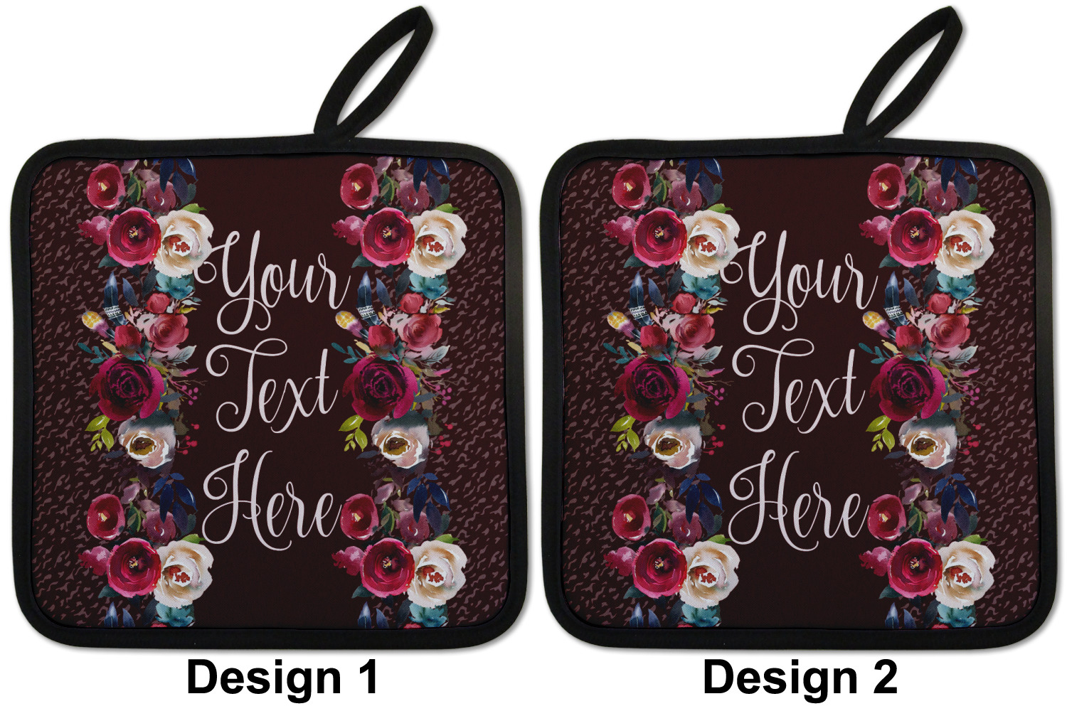Our personalized pot holders feature a neoprene front that displays your personalization in vibrant colors. The backing of the hot pot holder is rubberized; the textured backing allows you to have a great grip when using this custom pot holder. The two materials are joined with a sleek, black trim, and the holder also includes an attached loop for hanging and storage. The pot holder is approximately 8.75 inches by 8.75 inches and 0.25 inches tall, while the fabric loop is 2.5 inches long. You can purchase a kitchen pot holder by itself or as a set of 2. We also offer a set including one pot holder and one oven mitt.