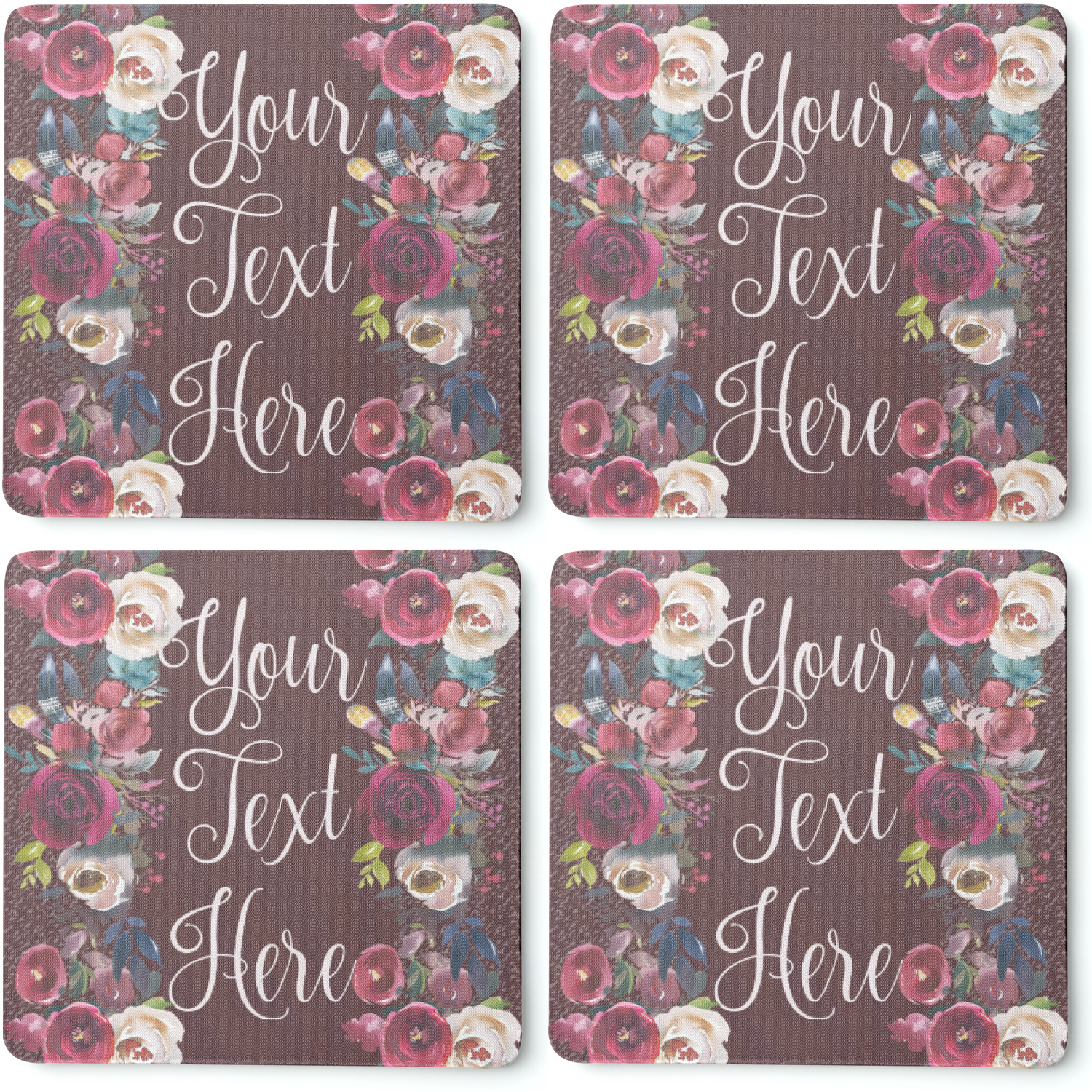 These drink coasters have a smooth, polyester top and a textured, rubber backing on its bottom. The non-slip rubber backing underneath works to keep any spills at bay. At 4 by 4 by 0.25 inches thick, these custom coasters are a suitable size for most drinkware. Your personalization is displayed atop the face of the cup coaster. We sell these rubber coasters in two different shapes: square and round. You can buy each shape as singulars or as a set of 4.