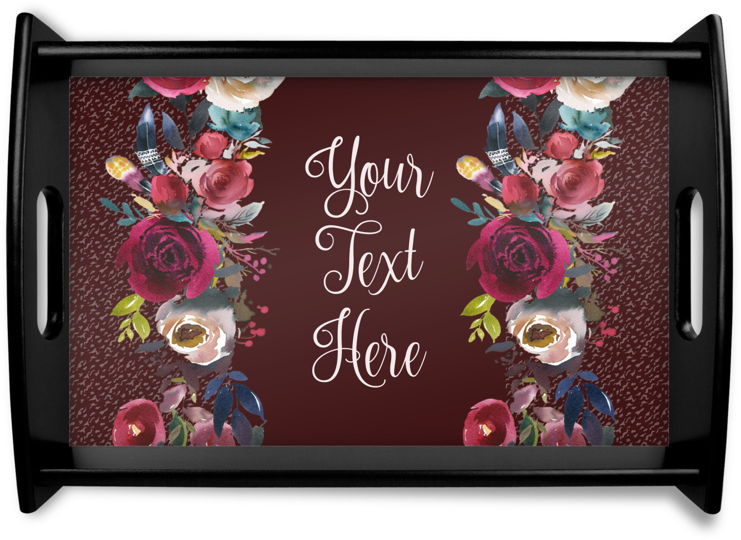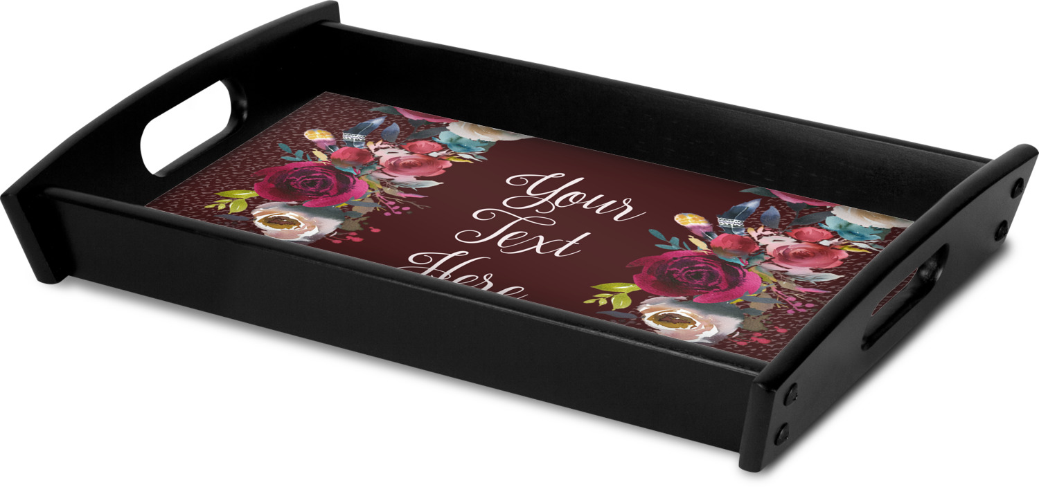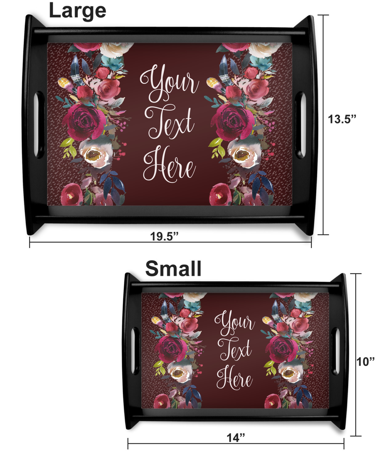 This serving tray with handles features square edges and two rounded sides, creating a very modern look. Each side is fabricated from a beautifully cut, natural wood. The bottom of the interior of the tray displays your customized design in bright, vibrant color. The tray is sold in both a black color and a natural wood look. Each variation of the wood serving tray has two sizes: Small, which is 14" x 10" x 2.25", and Large, which is 19.5" x 13.5" x 2.75".