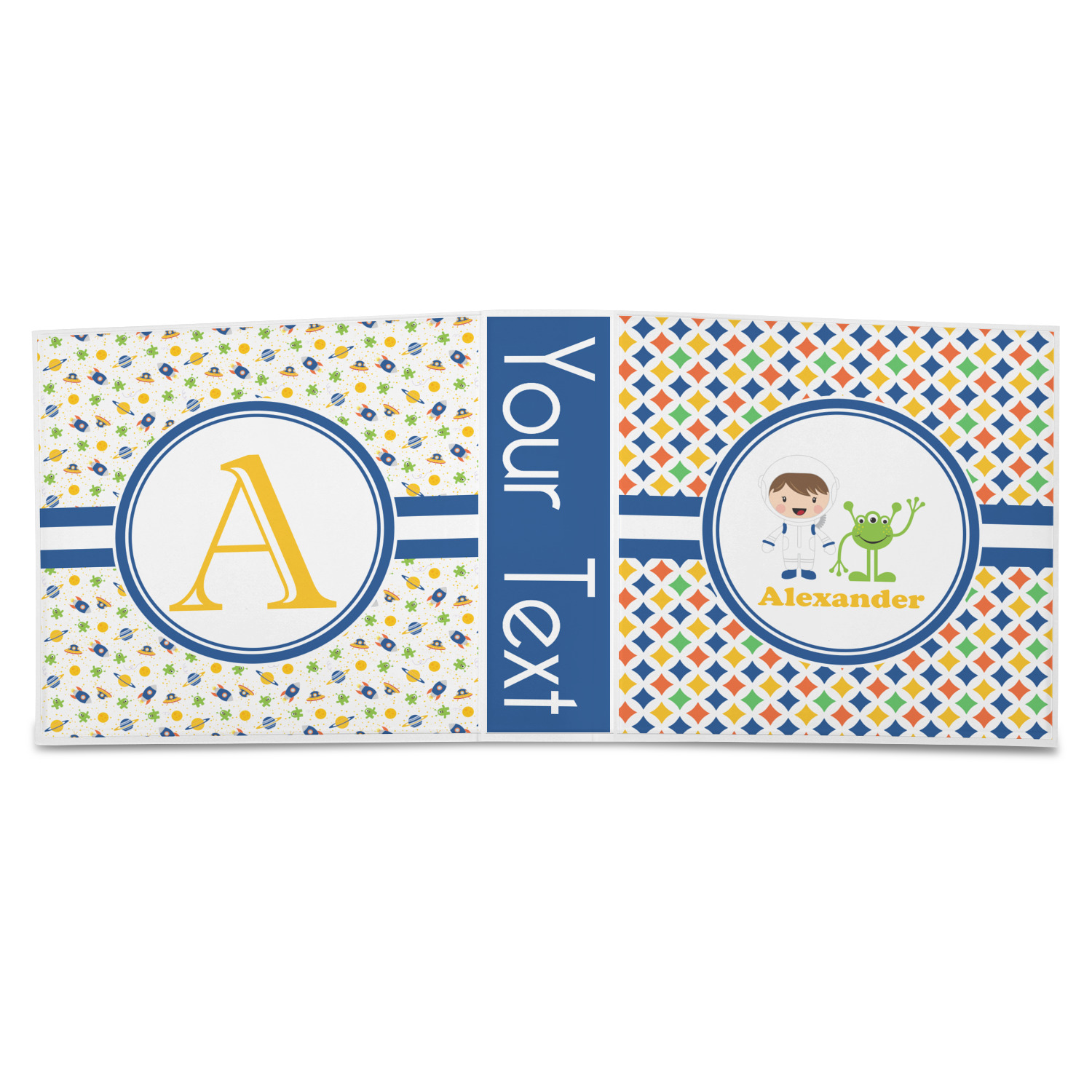 A white wide band trimmed in coordinating blue breaks up the pattern and showcases your little space guy with his martian buddy. Add personalization of your choice for that special touch.