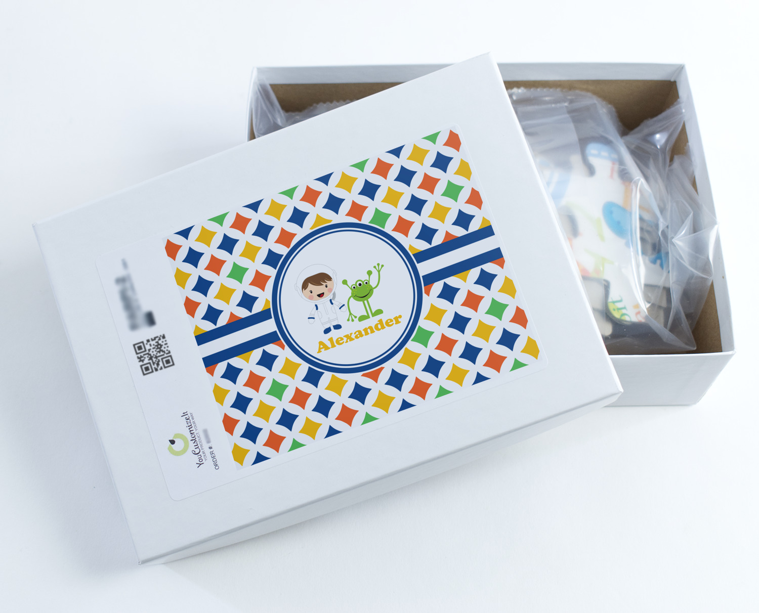 A white wide band trimmed in coordinating blue breaks up the pattern and showcases your little space guy with his martian buddy. Add personalization of your choice for that special touch.