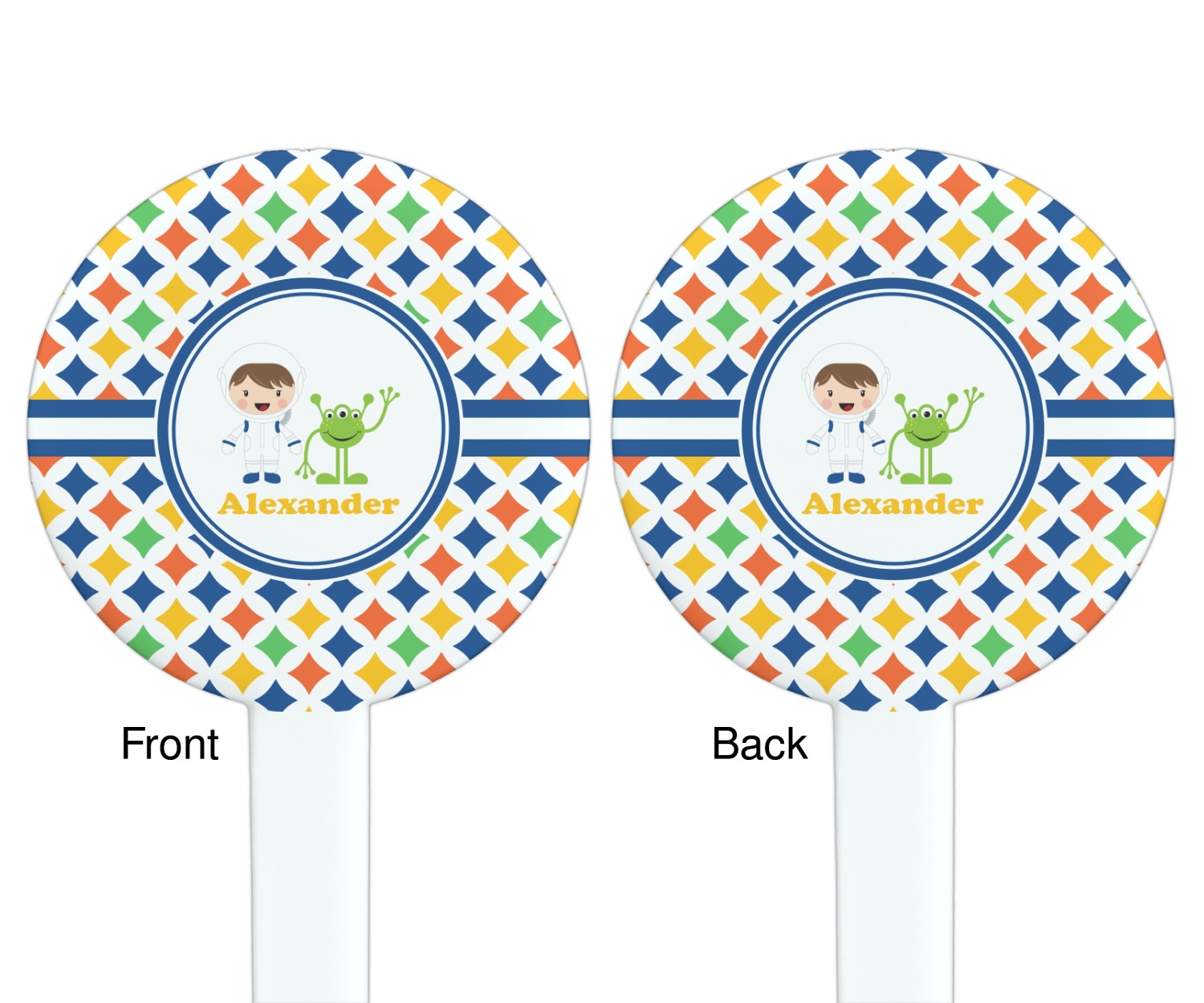 A white wide band trimmed in coordinating blue breaks up the pattern and showcases your little space guy with his martian buddy. Add personalization of your choice for that special touch.