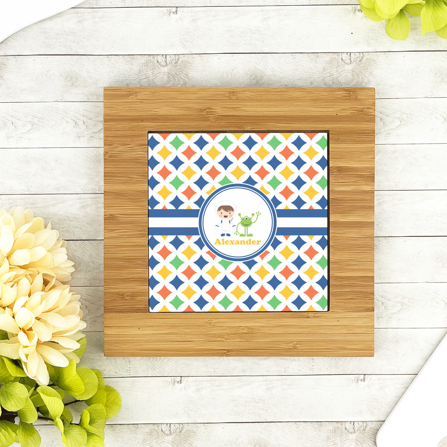 The center is highlighted by a 6in ceramic tile that is printed with the design of your choice. The tile sits slightly higher than the bamboo to ensure the majority of the heat stays on the tile not on the bamboo.