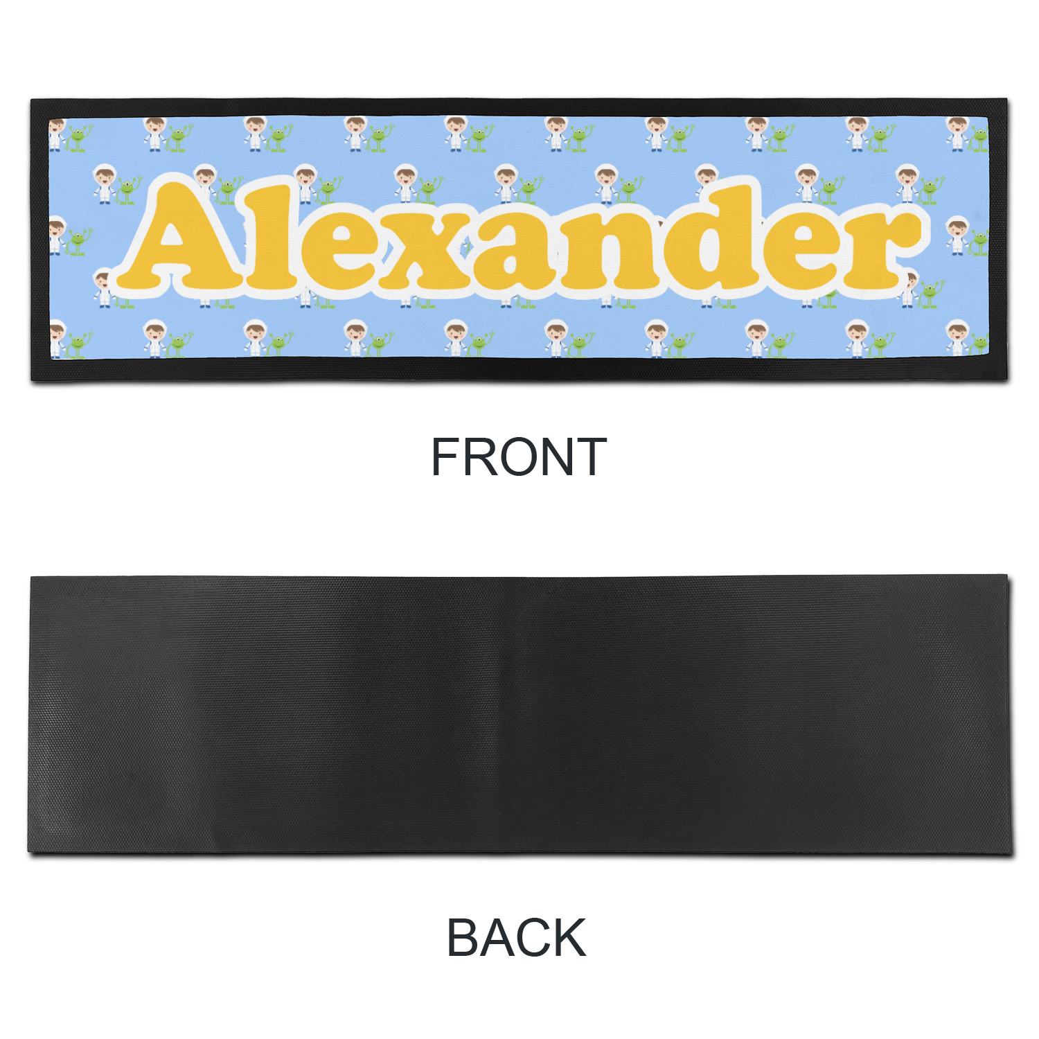A white wide band trimmed in coordinating blue breaks up the pattern and showcases your little space guy with his martian buddy. Add personalization of your choice for that special touch.