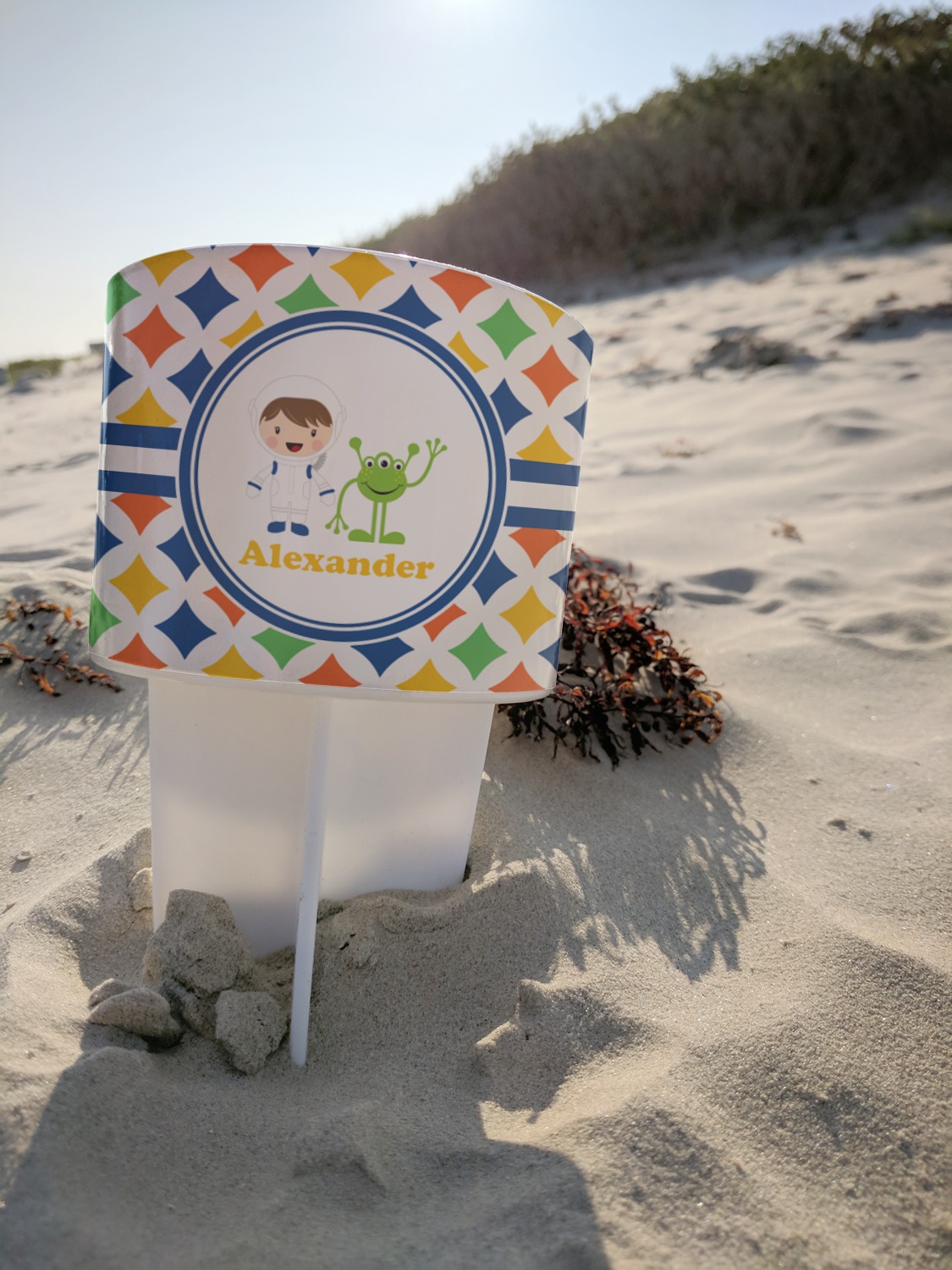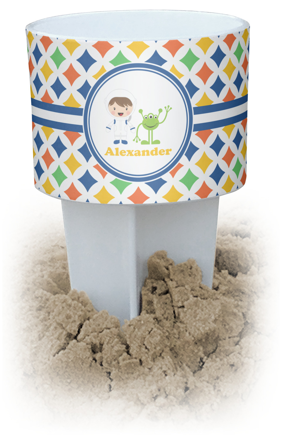This cup holder has a large stake at its bottom that anchors it to the sand or ground below, while the cup holder rests above the stake. The entire drink holder is made of durable plastic and displays your customization around the cup holder portion. We sell these personalized beach spikers in two different colors: black and white.