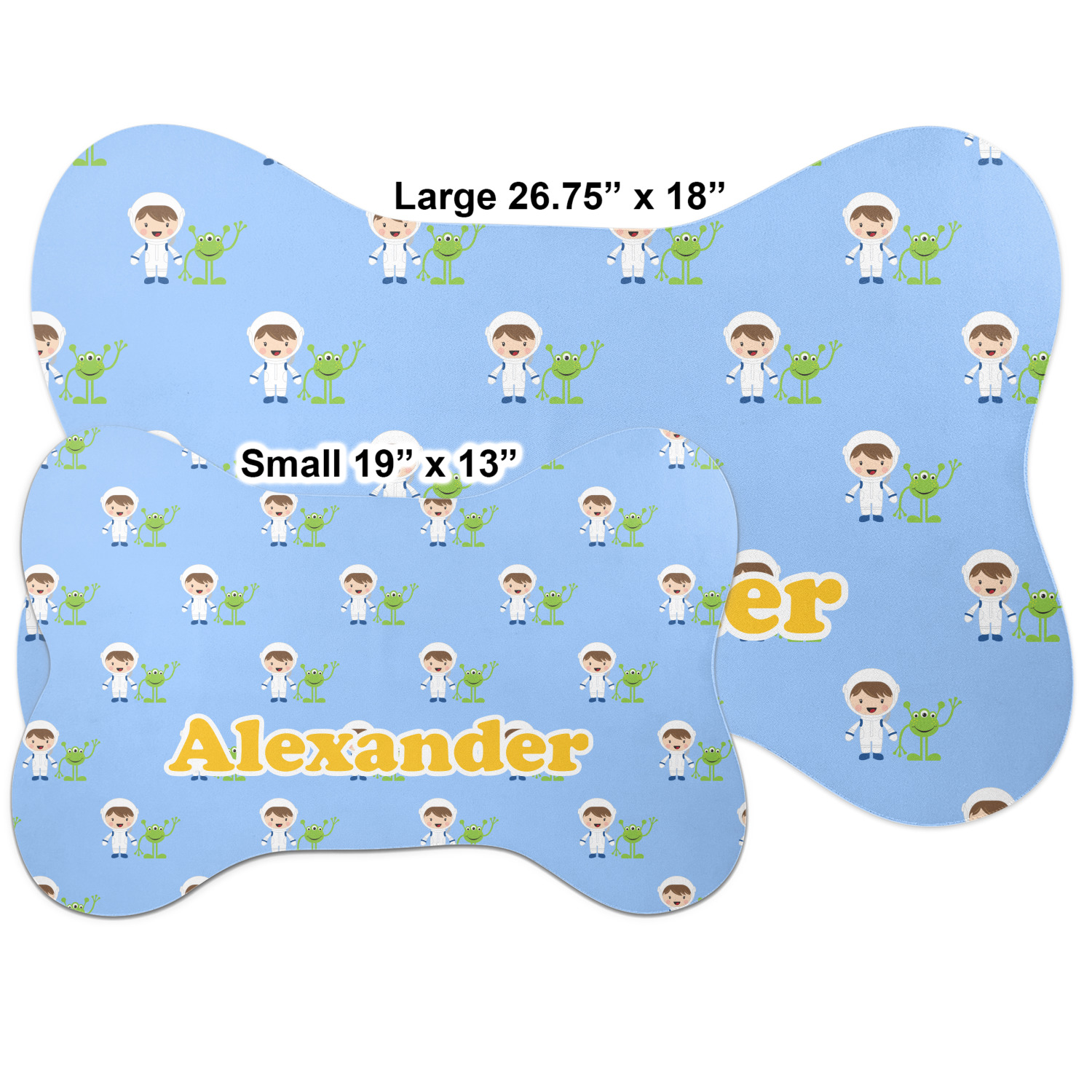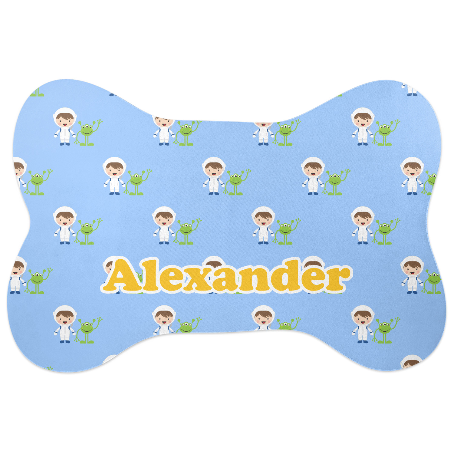 A white wide band trimmed in coordinating blue breaks up the pattern and showcases your little space guy with his martian buddy. Add personalization of your choice for that special touch.