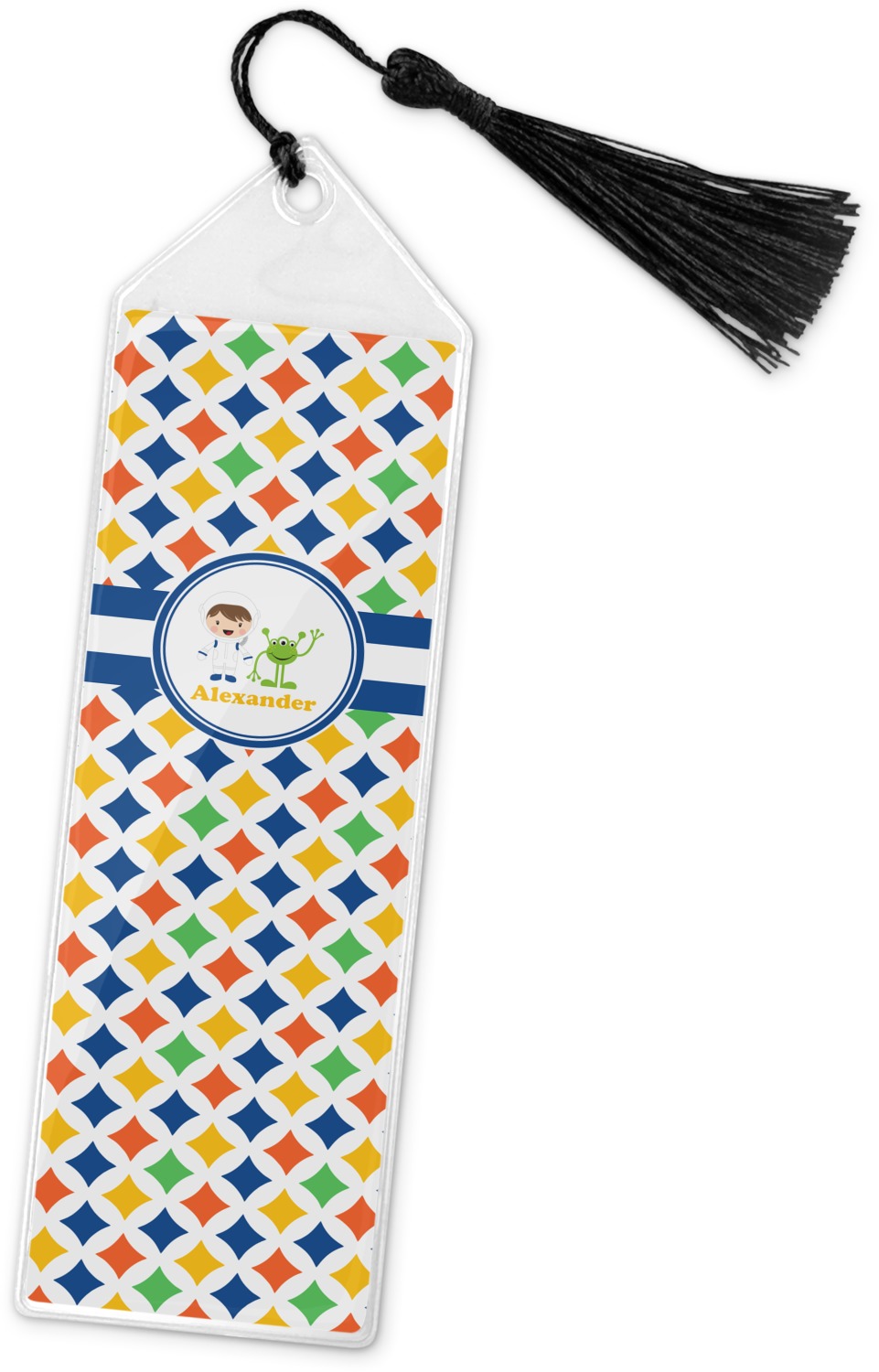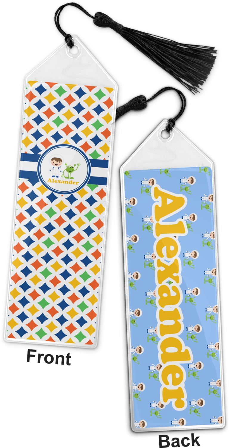 Your personalized bookmark is made of a sturdy, clear vinyl, and is approximately 7.5" x 2.25". We display your personalization on vinyl inserts that are placed on both sides. Accompanying each book marker is a black, fringe tassel that attaches to the reinforced, triangular header.