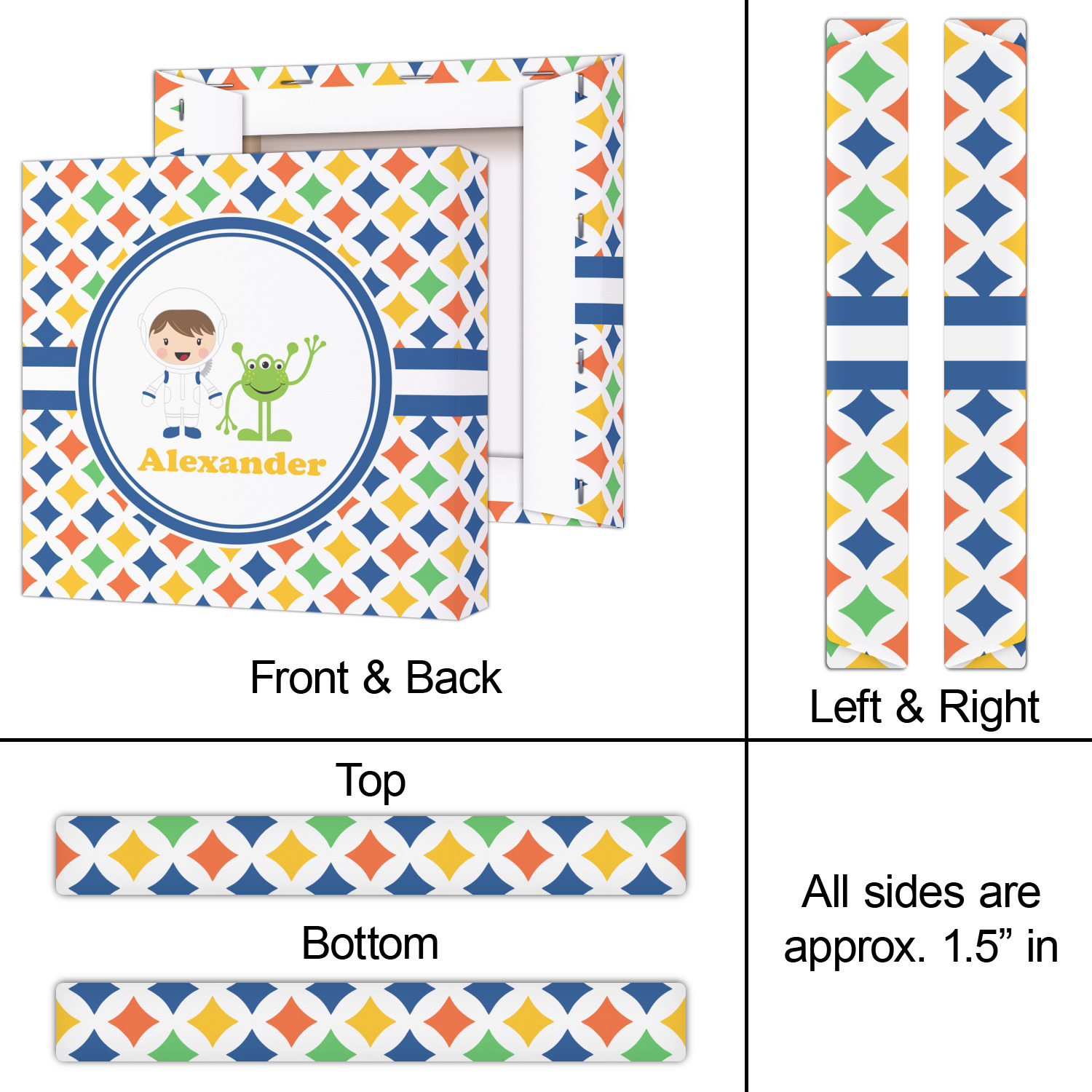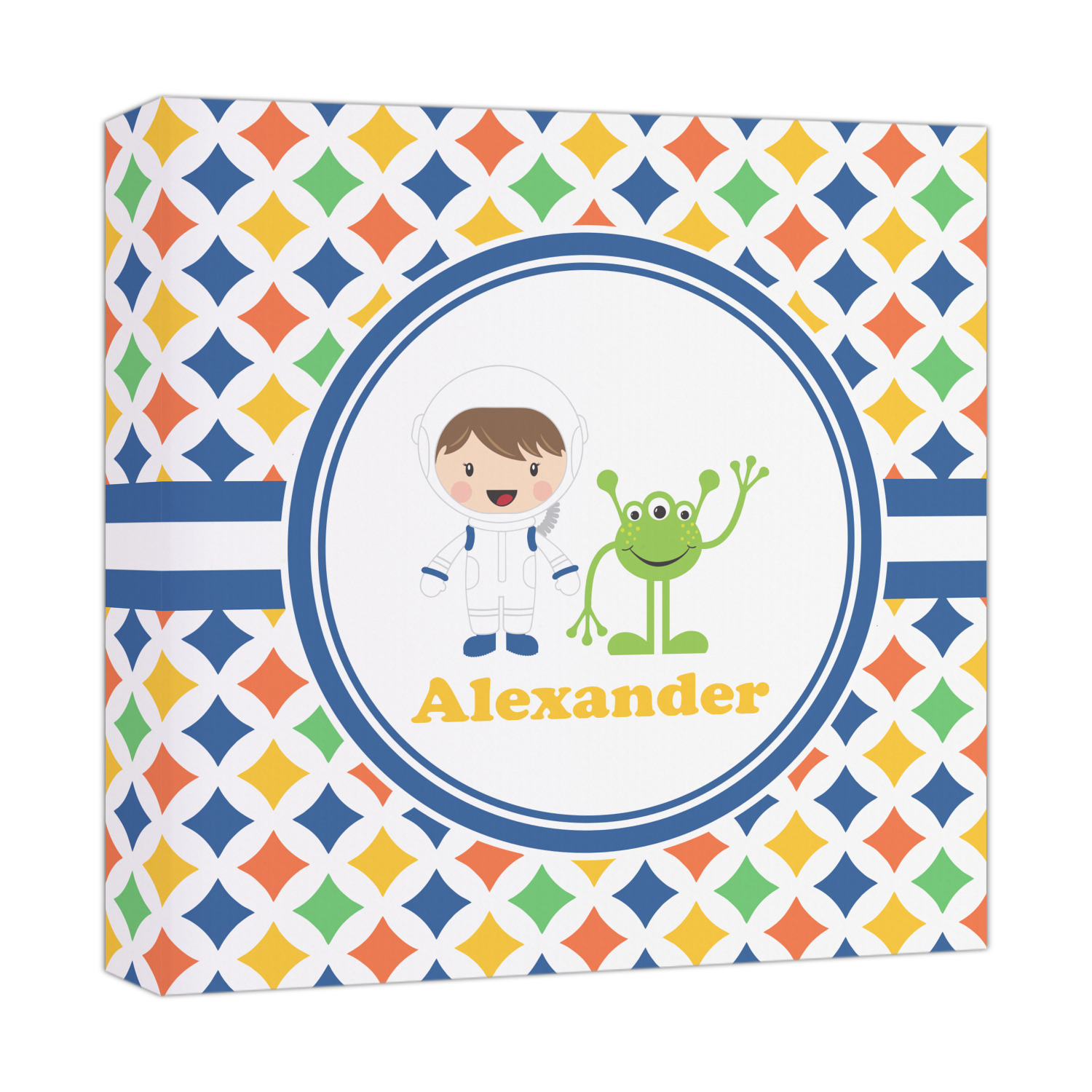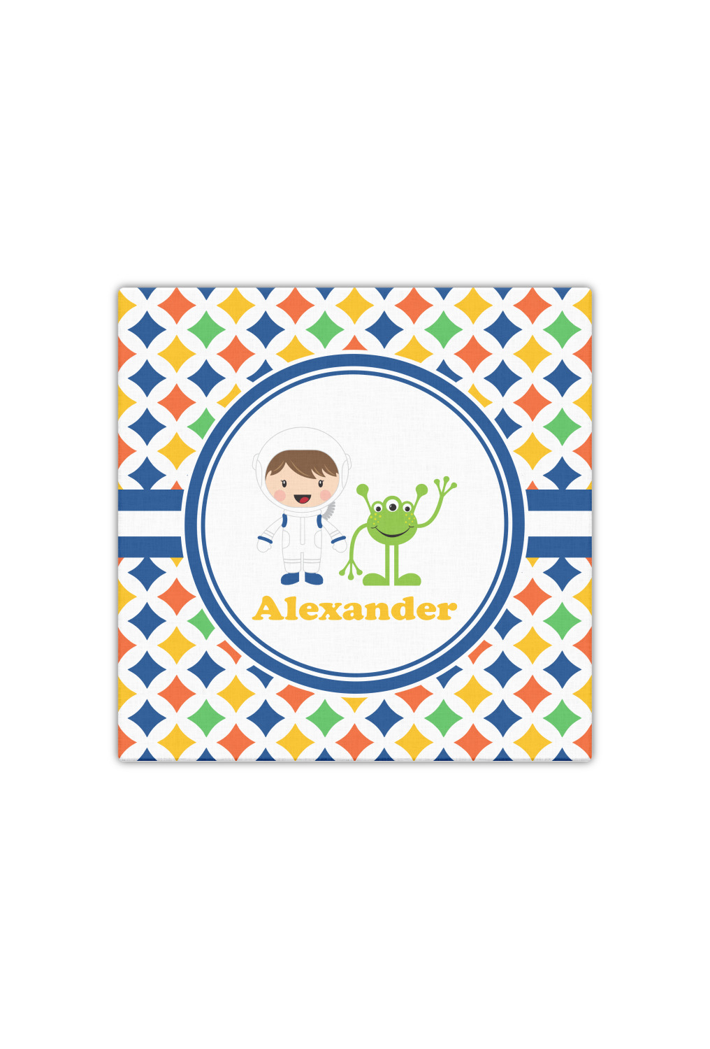 A white wide band trimmed in coordinating blue breaks up the pattern and showcases your little space guy with his martian buddy. Add personalization of your choice for that special touch.