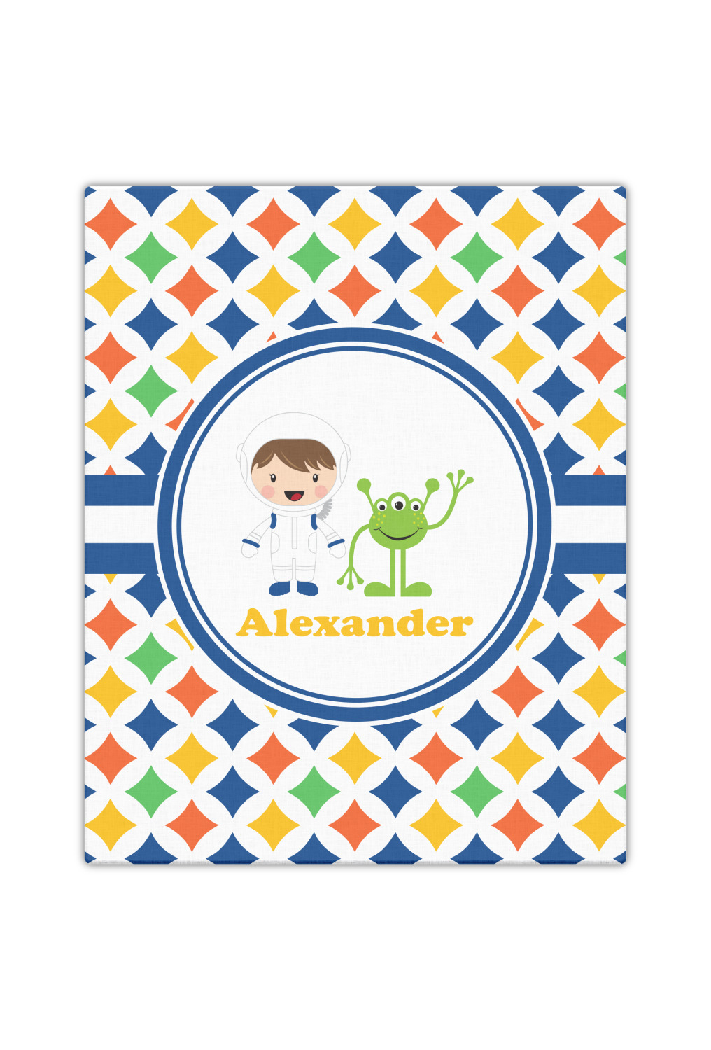 A white wide band trimmed in coordinating blue breaks up the pattern and showcases your little space guy with his martian buddy. Add personalization of your choice for that special touch.