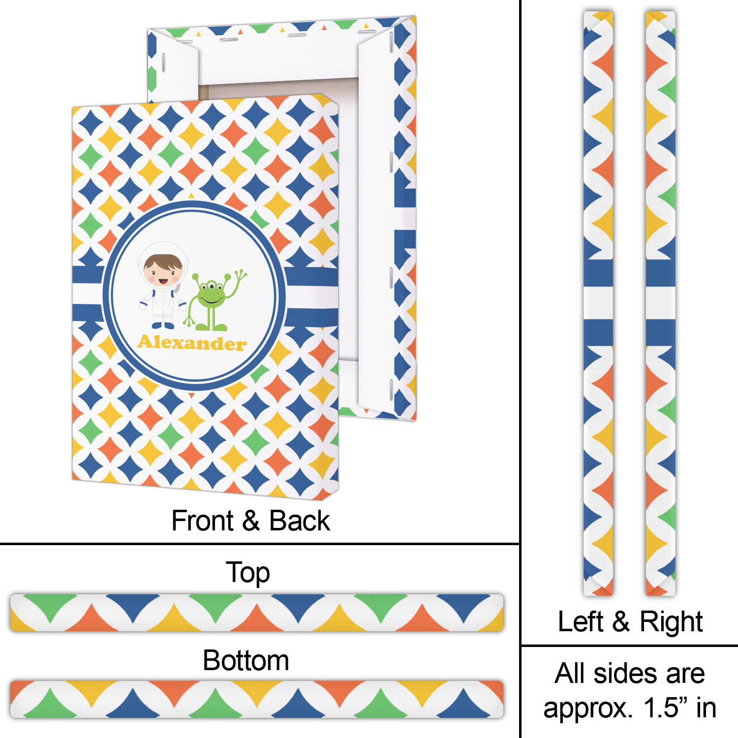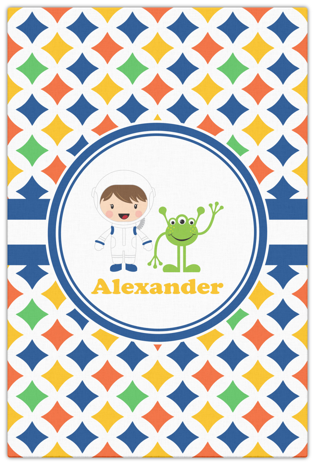 A white wide band trimmed in coordinating blue breaks up the pattern and showcases your little space guy with his martian buddy. Add personalization of your choice for that special touch.