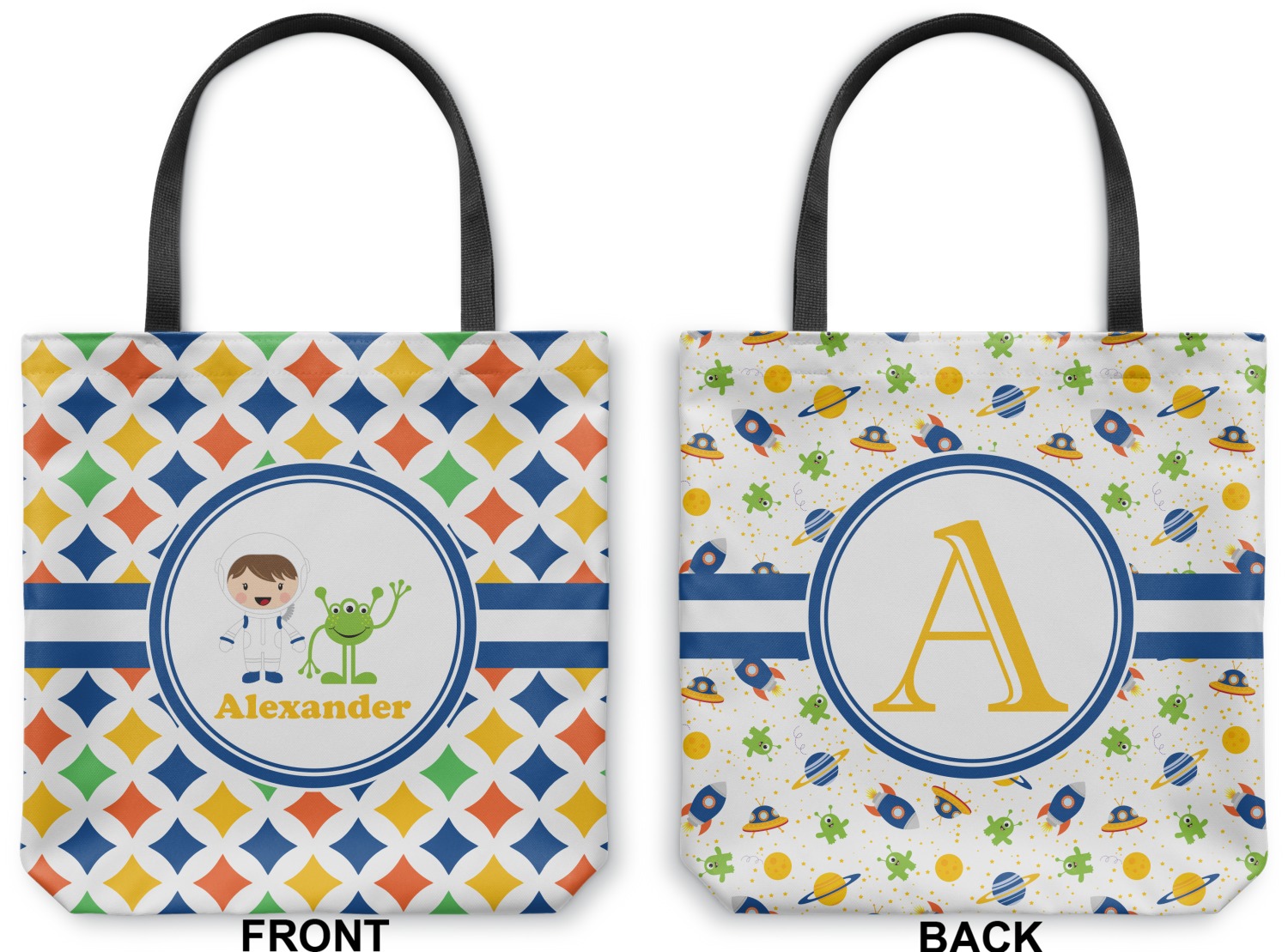 A white wide band trimmed in coordinating blue breaks up the pattern and showcases your little space guy with his martian buddy. Add personalization of your choice for that special touch.