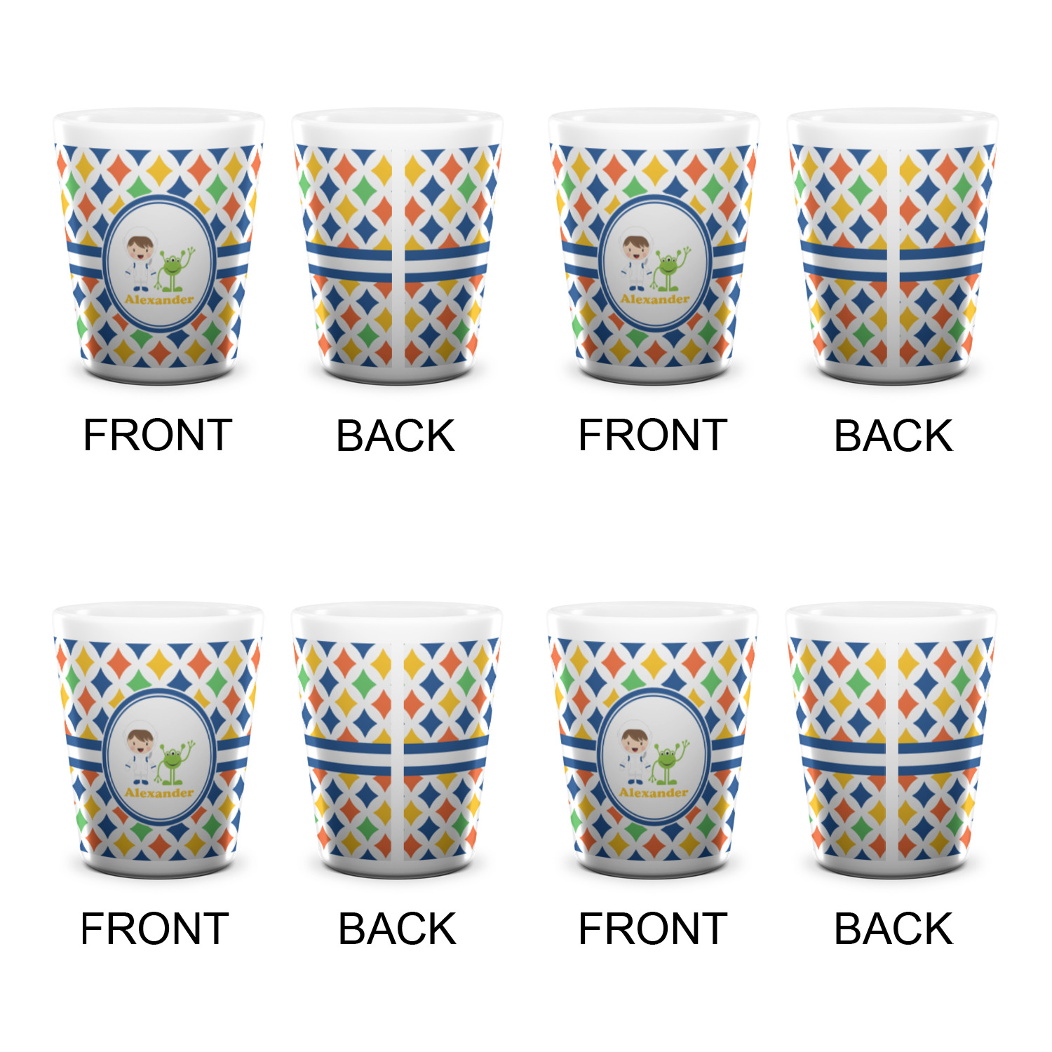 Made from ceramic these shot glasses are printed in full color with the design of your choice. These are a standard 1.5oz size and stand 2.25" tall. Available in a full white ceramic or a two-tone with a black color inside the shot glass. Buy a single or a set of 4, all of which can be designed separately to get you just what you want and need.
