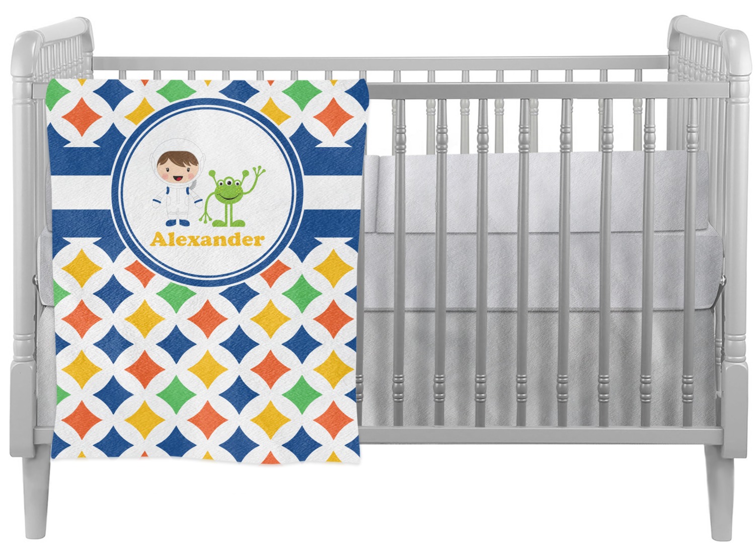 A white wide band trimmed in coordinating blue breaks up the pattern and showcases your little space guy with his martian buddy. Add personalization of your choice for that special touch.