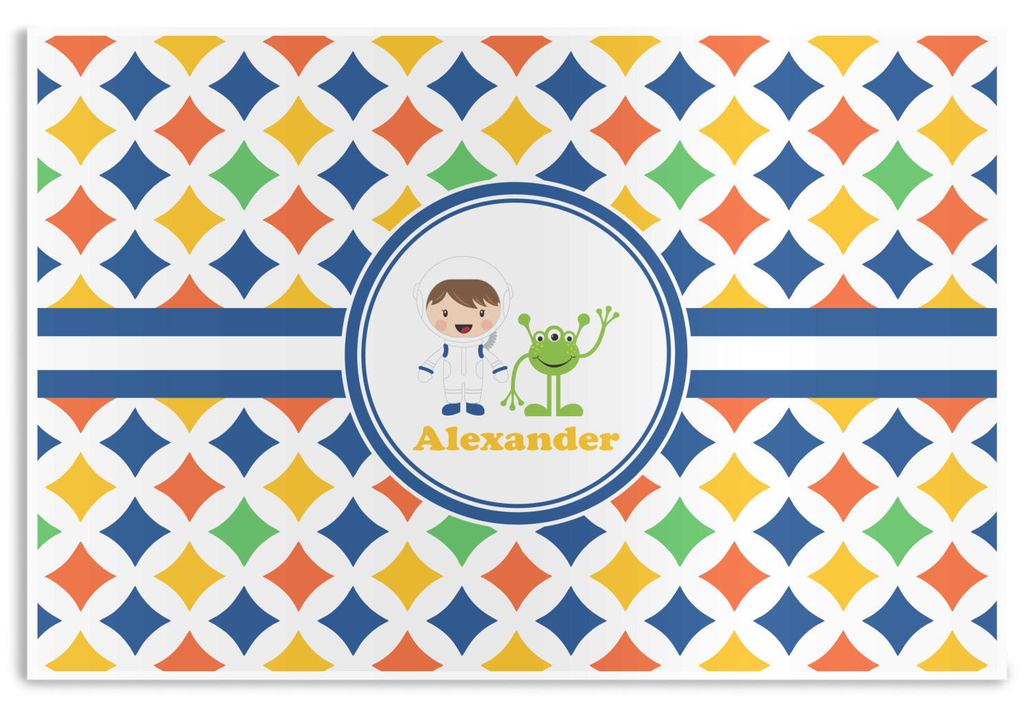 A white wide band trimmed in coordinating blue breaks up the pattern and showcases your little space guy with his martian buddy. Add personalization of your choice for that special touch.