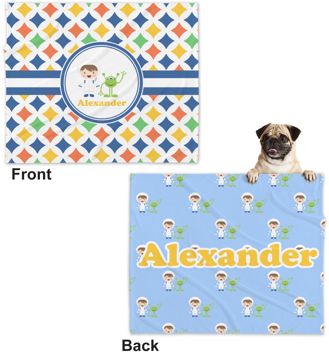 A white wide band trimmed in coordinating blue breaks up the pattern and showcases your little space guy with his martian buddy. Add personalization of your choice for that special touch.