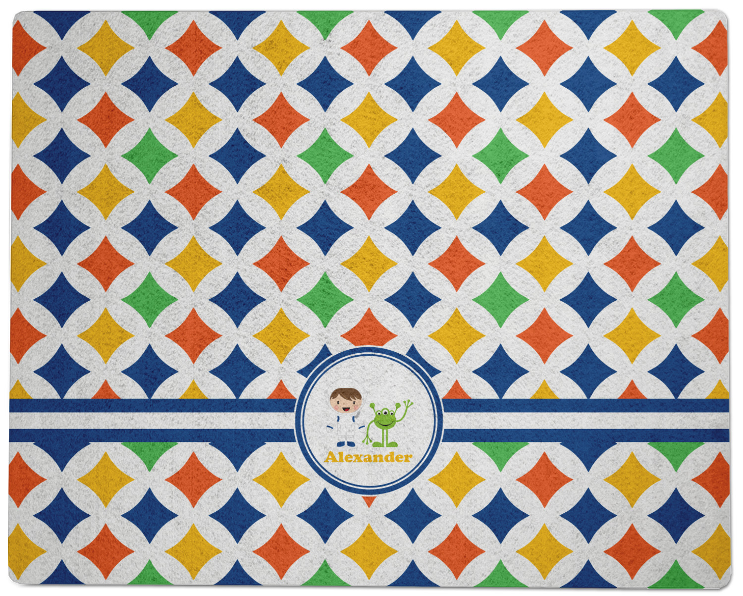 A white wide band trimmed in coordinating blue breaks up the pattern and showcases your little space guy with his martian buddy. Add personalization of your choice for that special touch.