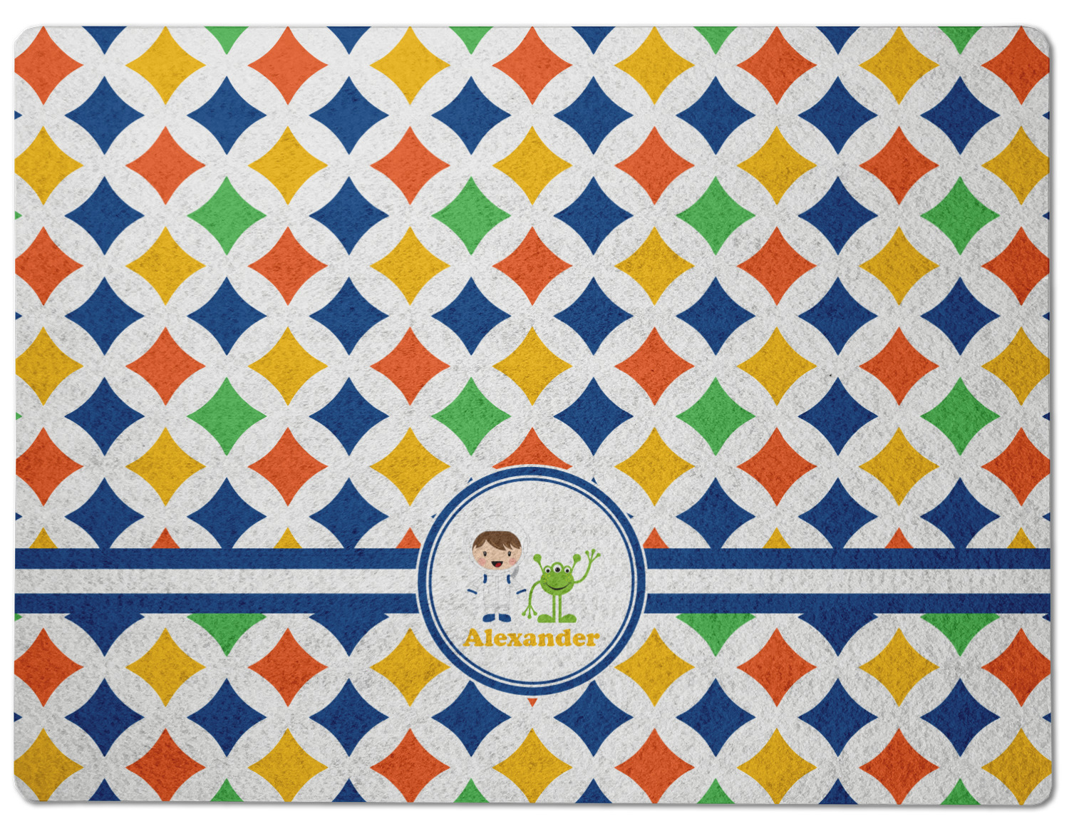 A white wide band trimmed in coordinating blue breaks up the pattern and showcases your little space guy with his martian buddy. Add personalization of your choice for that special touch.