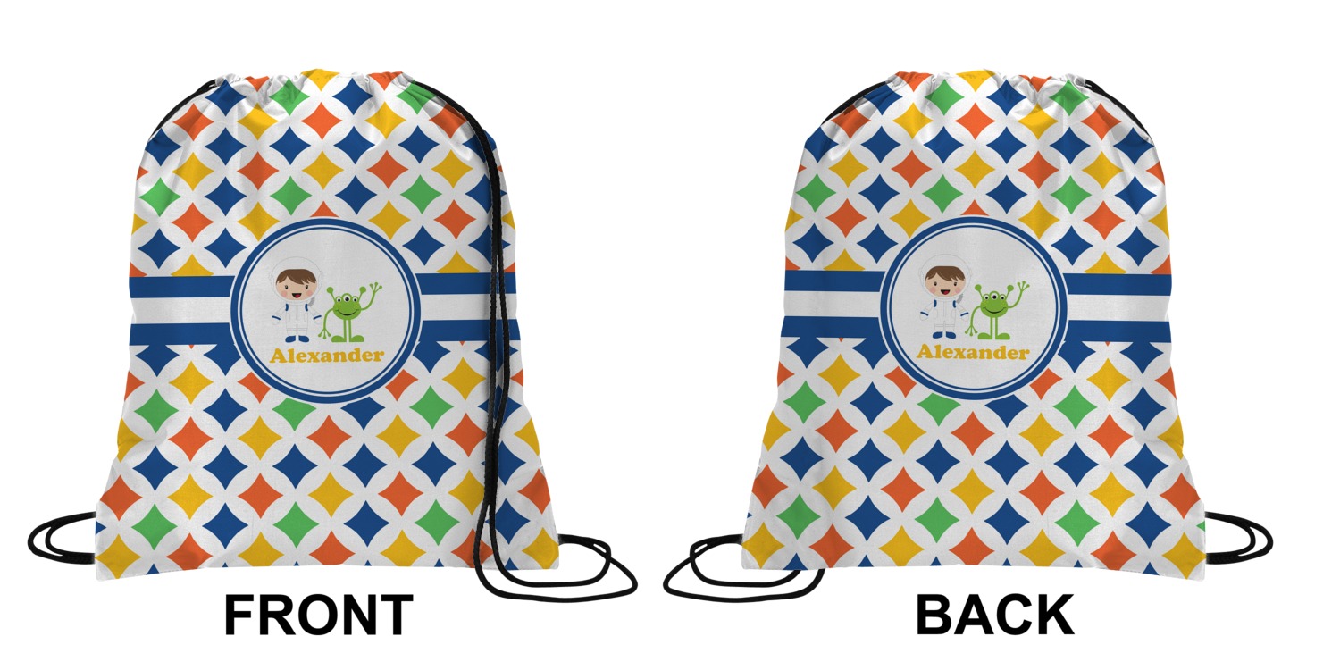 Your custom design will appear on the front and the back of the backpack. You can customize each side individually. The inside of the backpack is white and the drawstrings are black. The back pack is made of 100% polyester fabric.