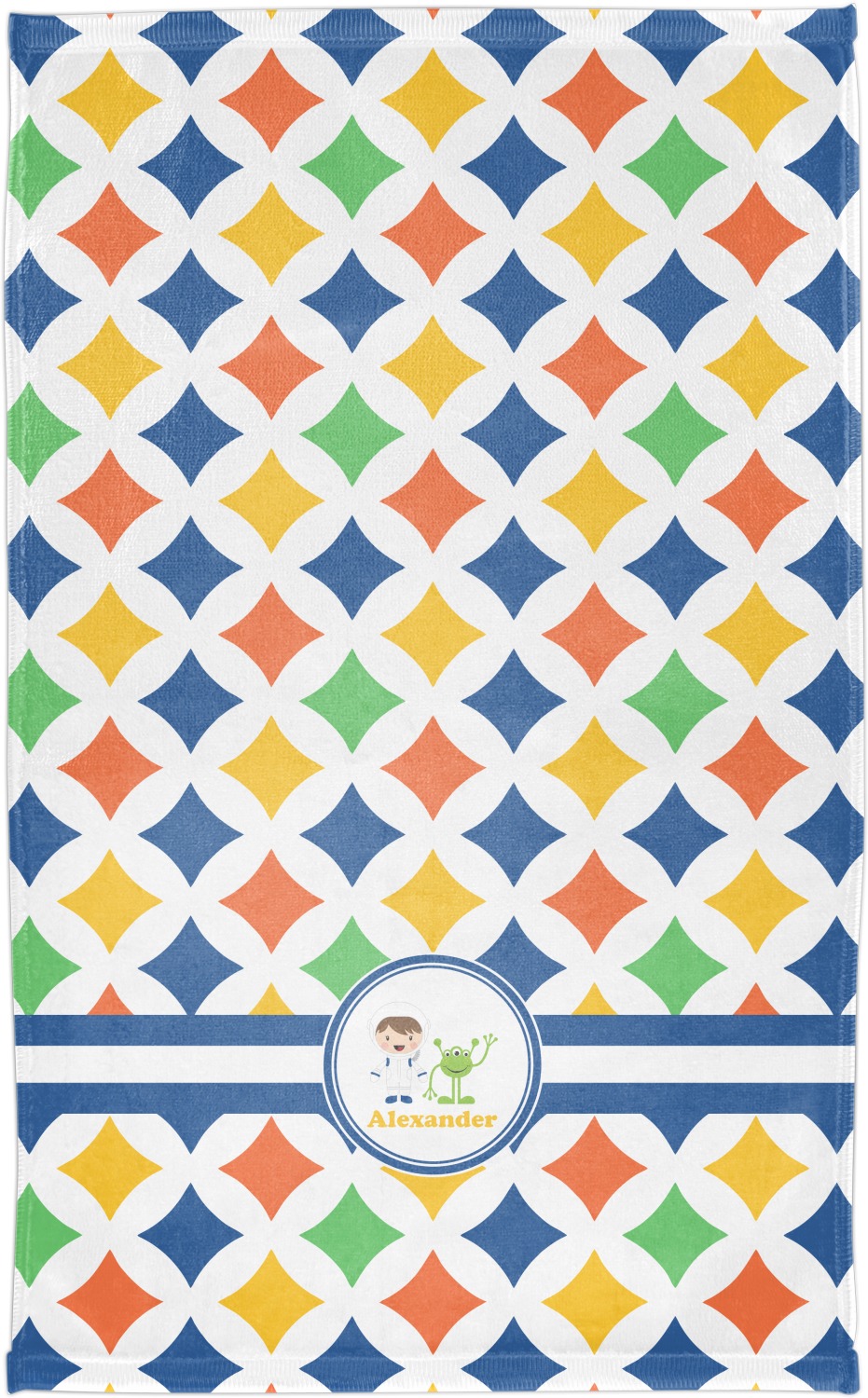 A white wide band trimmed in coordinating blue breaks up the pattern and showcases your little space guy with his martian buddy. Add personalization of your choice for that special touch.