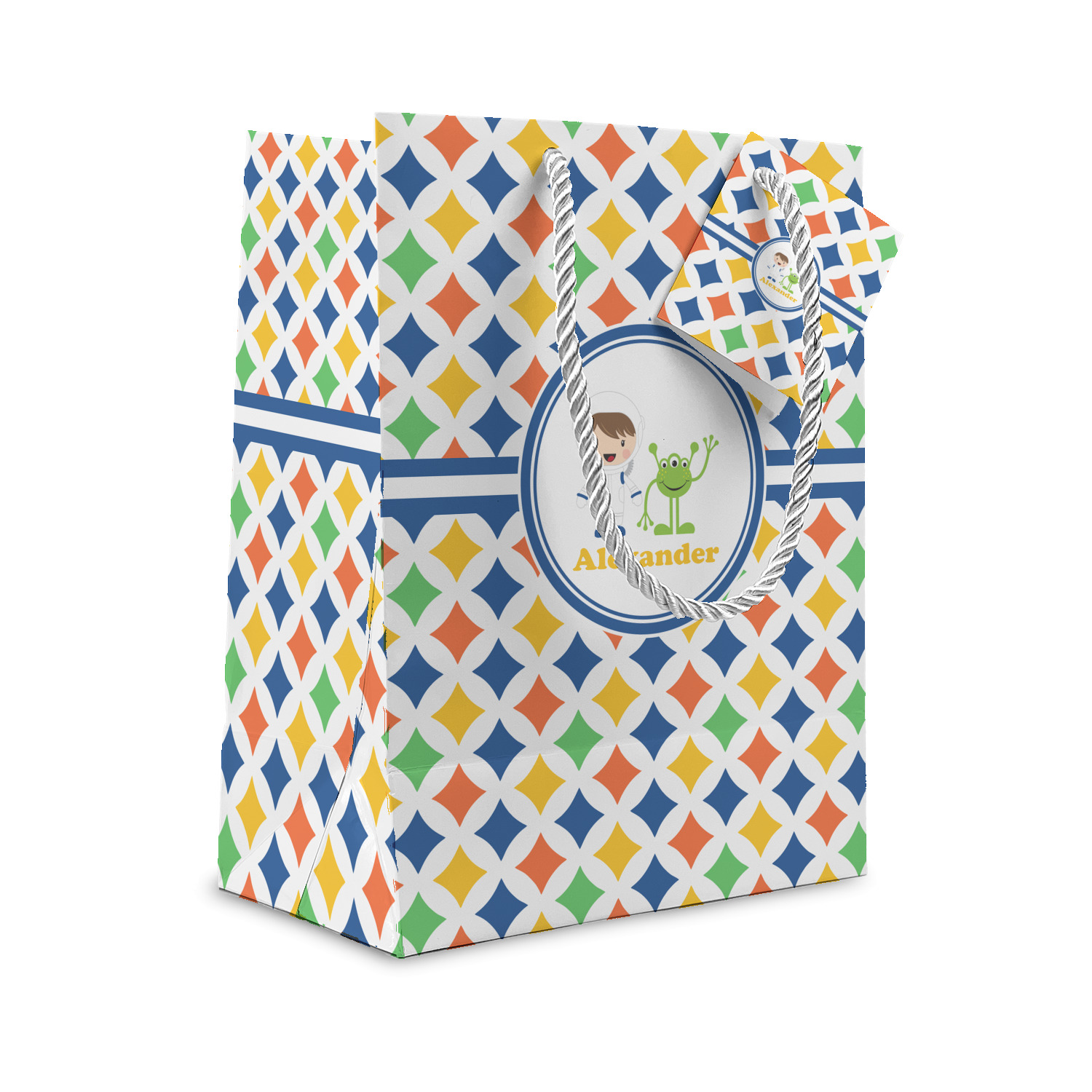 A white wide band trimmed in coordinating blue breaks up the pattern and showcases your little space guy with his martian buddy. Add personalization of your choice for that special touch.