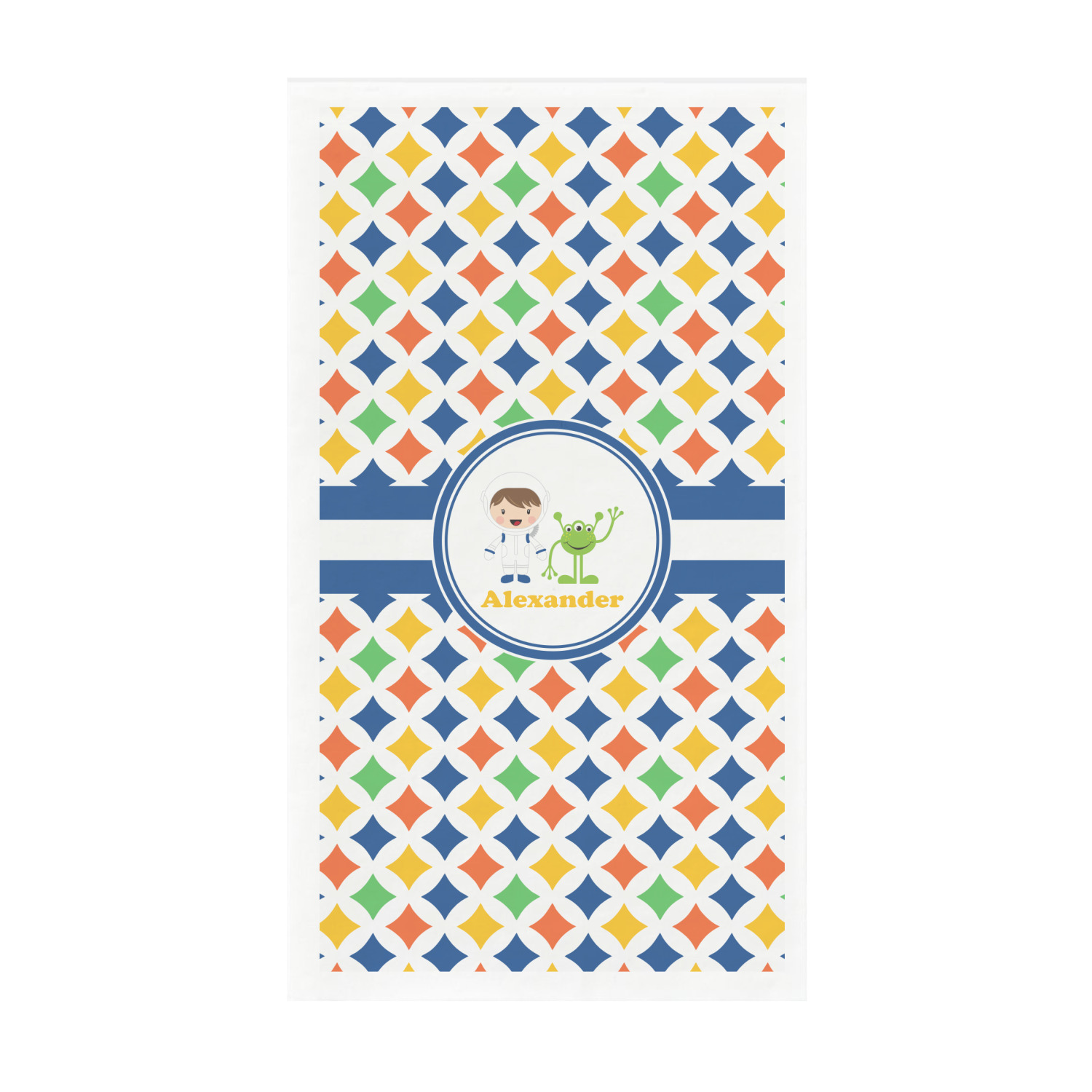 A white wide band trimmed in coordinating blue breaks up the pattern and showcases your little space guy with his martian buddy. Add personalization of your choice for that special touch.