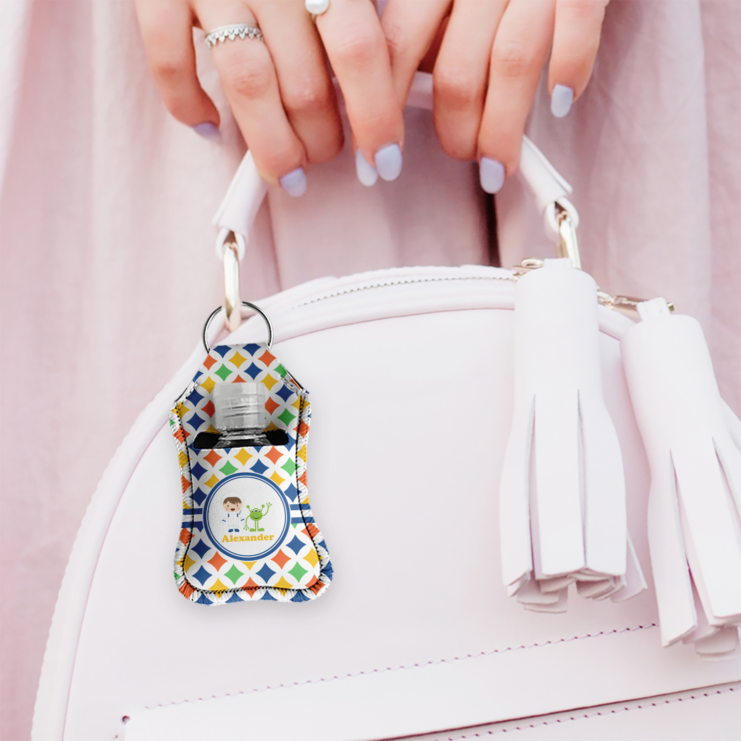 Each hand sanitizer holder comes with its own empty travel-sized, refillable hand sanitizer sure to fit snug in your customized sanitizer case! Our hand sanitizer cases are a durable, yet soft neoprene material sure to last any daily activities or travel agenda. Customize and personalize a hand sanitizer bottle holder with one of our two sizes - small (4.25" x 2.25") or large (5.5" x 2.5"). Each travel sanitizer holder comes with a keyring for attachment on bags, keys, or more!