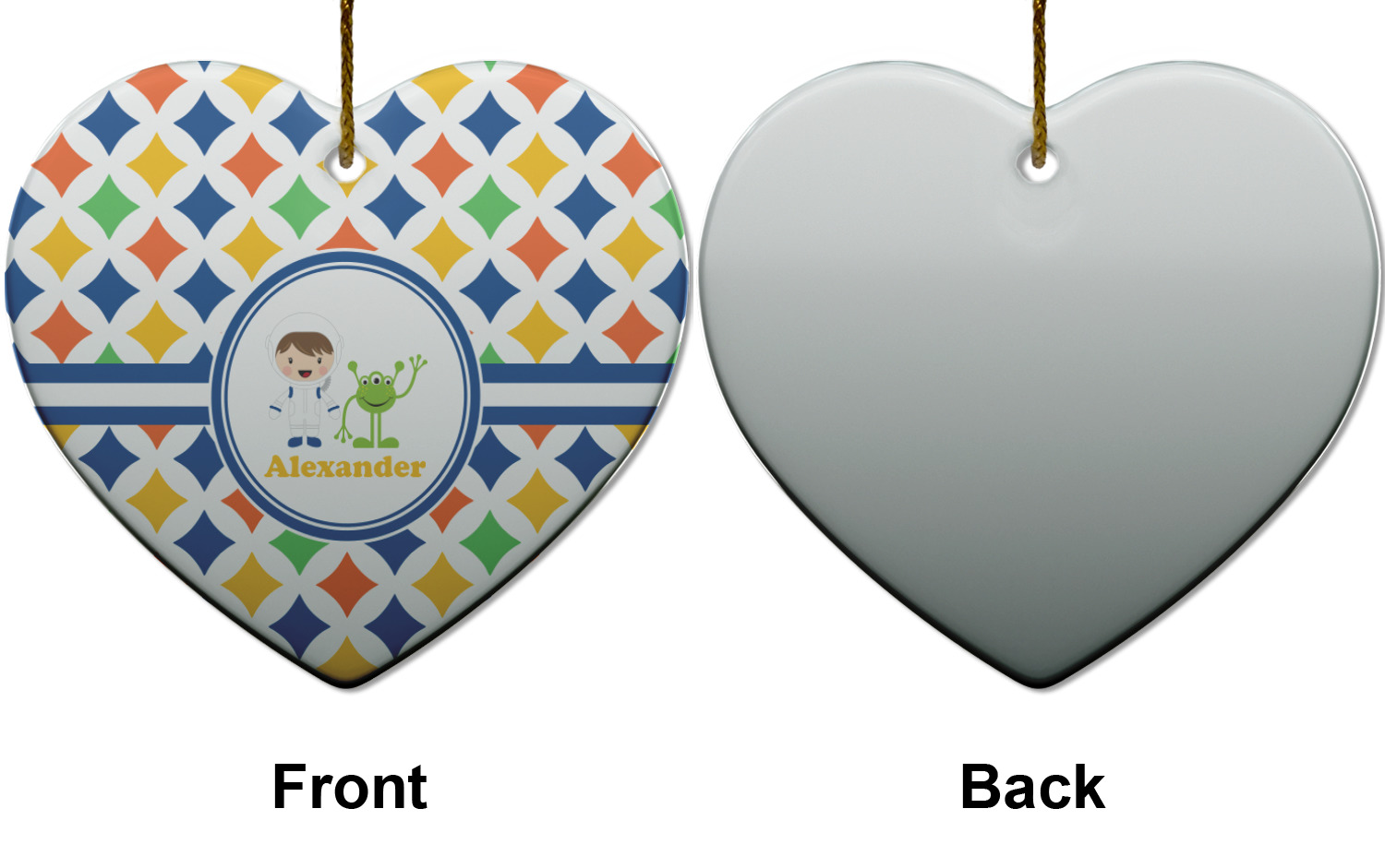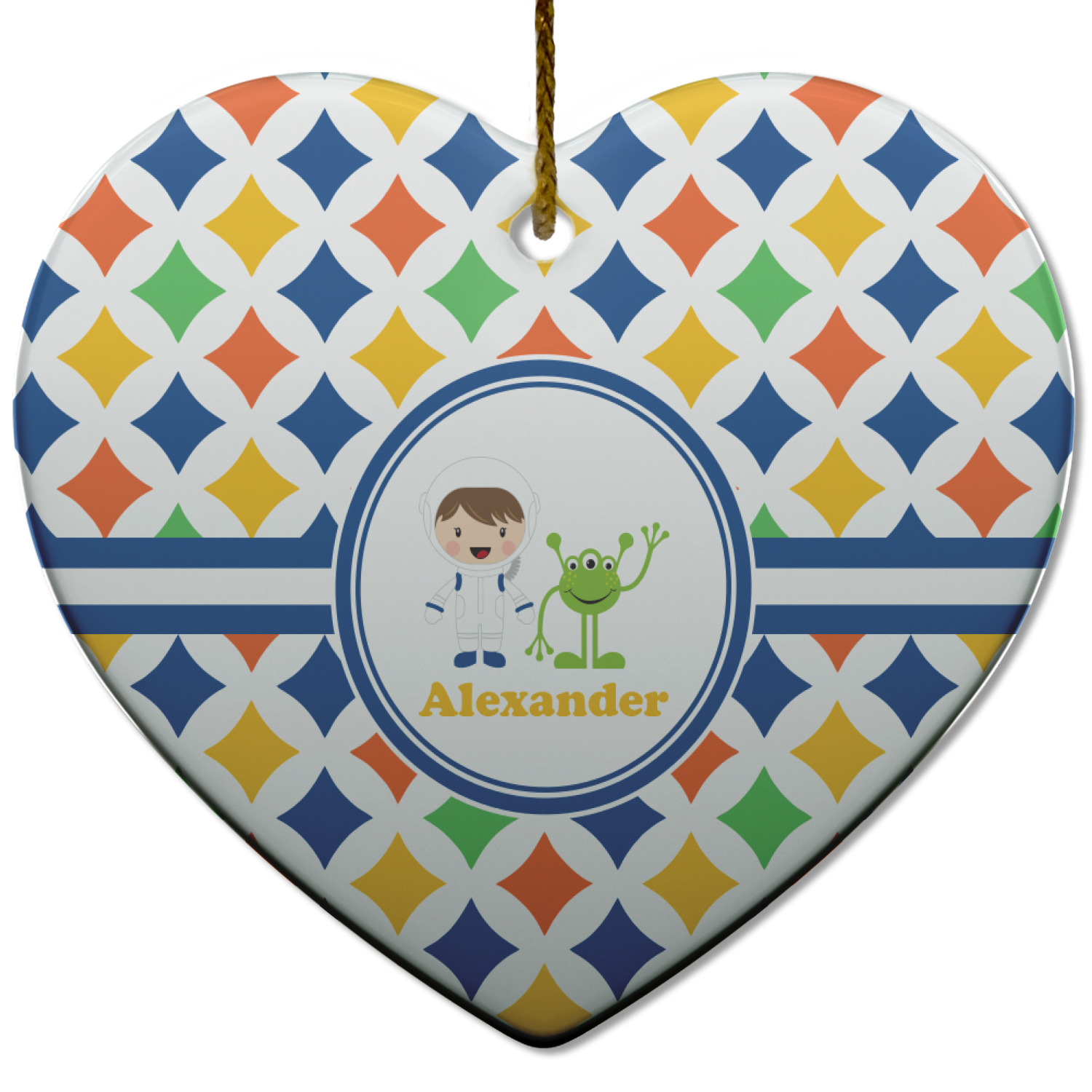 A white wide band trimmed in coordinating blue breaks up the pattern and showcases your little space guy with his martian buddy. Add personalization of your choice for that special touch.