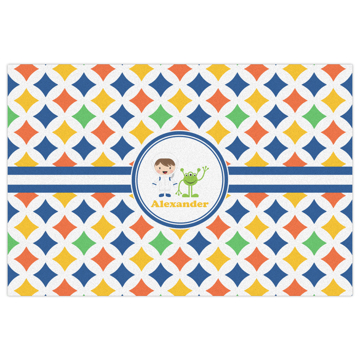 A white wide band trimmed in coordinating blue breaks up the pattern and showcases your little space guy with his martian buddy. Add personalization of your choice for that special touch.