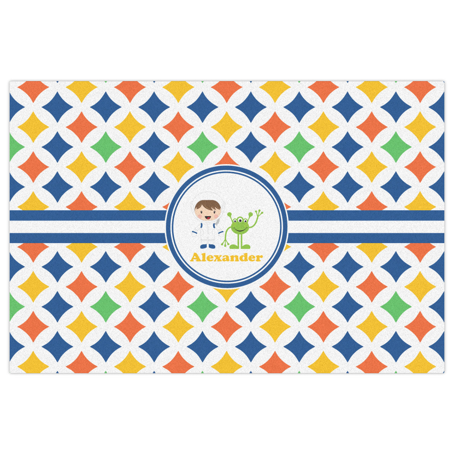 A white wide band trimmed in coordinating blue breaks up the pattern and showcases your little space guy with his martian buddy. Add personalization of your choice for that special touch.
